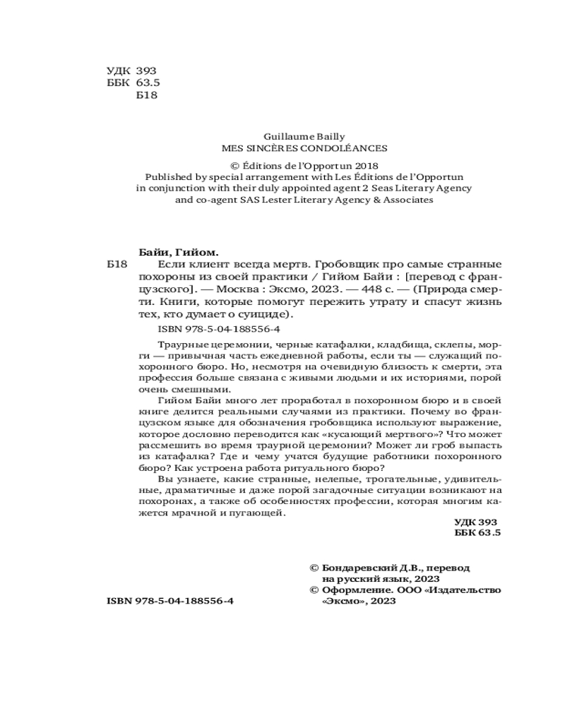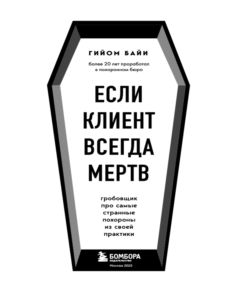 |  | Если клиент всегда мертв. Гробовщик про самые странные похороны из своей практики    	Гийом Байи Серия: Природа смерти. Книги, которые помогут пережить утрату и спасут жизнь тех, кто думает о суициде Во Франции для обозначения гробовщика используется составное слово croque-mort, что буквально означает «кусающий мертвого». Согласно народной легенде, гробовщики сильно кусали покойника за палец ноги, чтобы убедиться в том, что их клиент действительно мертв. Отсутствие реакции якобы служило доказательством перехода в иной мир. На самом деле это слово имеет другое происхождение...А какое — вы узнаете из этой книги!