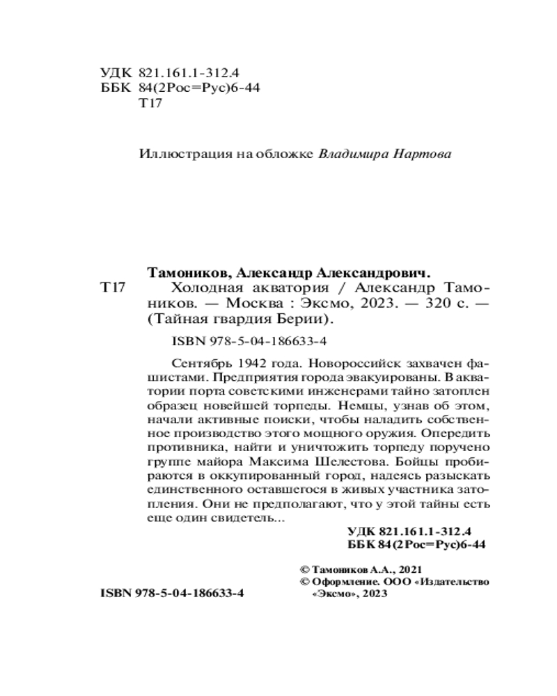 Холодная акваторияАлександр Александрович Тамоников В данный момент этот товар отсутствует в продаже. Возможно, у нас найдется аналогичный или похожий товар здесь. Серия: Тайная гвардия Берии (обложка) Роман о военном времени, о сложных судьбах и опасной работе неизвестных героев, вошедших в ударный состав «спецназа Берии». |