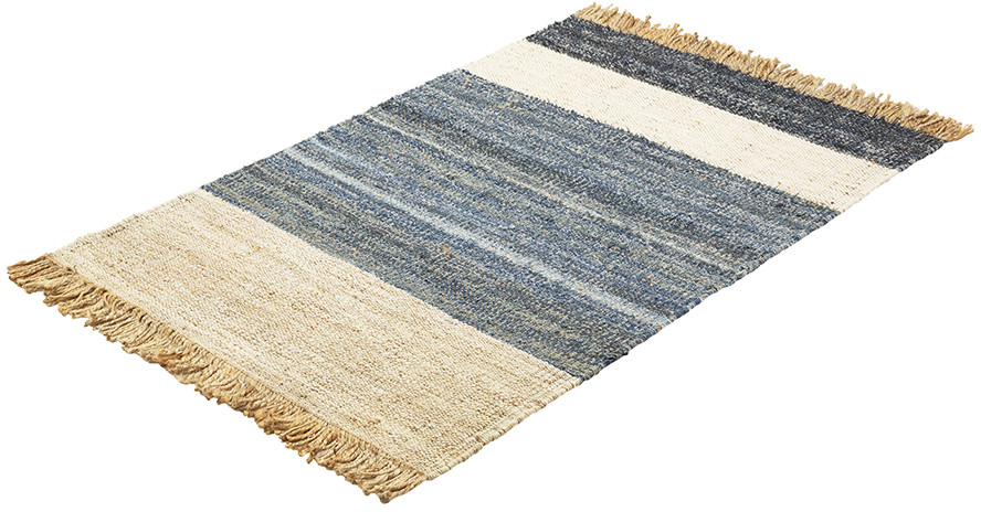 Ковер Hyderabad из коллекции Ethnic отлично смотрится в современных интерьерах и эклектичных пространствах. Одним из главных достоинств дизайна является сочетание трех уникальных материалов. Джут делает это напольное покрытие практичным и долговечным, обеспечивая стойкость к износу и сохраняя его первоначальную форму на протяжении долгого времени. Деним добавляет в оформление модный акцент. Шерсть придает изделию мягкость, создавая приятное ощущение под ногами. Благодаря натуральной цветовой палитре ковер прекрасно гармонирует с мебелью и предметами интерьера любых оттенков.