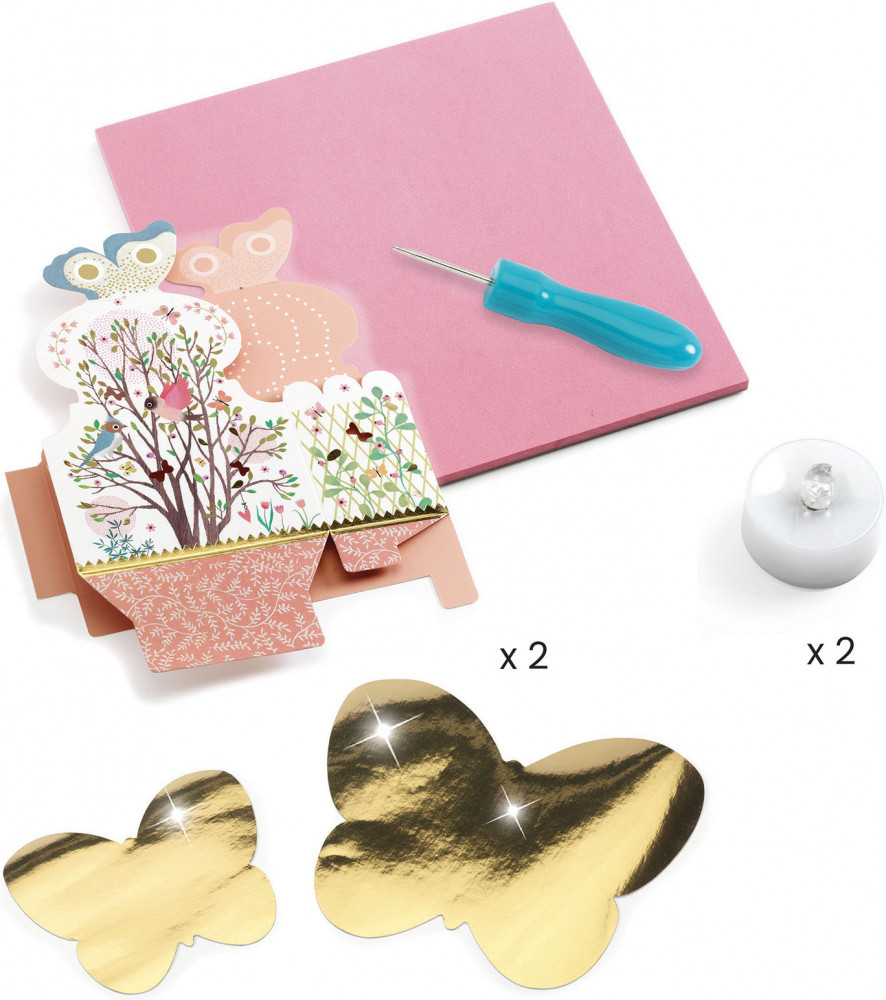 Набор для творчества Djeco «Свет и тень» — это 2 чудесных фонарика, которые создаются путем сбора коробочек прокалывания боковых сторон. Они делают атмосферу более прекрасной, особенно когда наступает ночь и фонари зажигаются. Фонарики отбрасывают ажурную тень, когда внутри включена безопасная светодиодная свеча. Свеча автоматически выключается через 30 минут. Размеры фонарей: 16 × 10 × 8 см и 12 × 8 × 8 см.