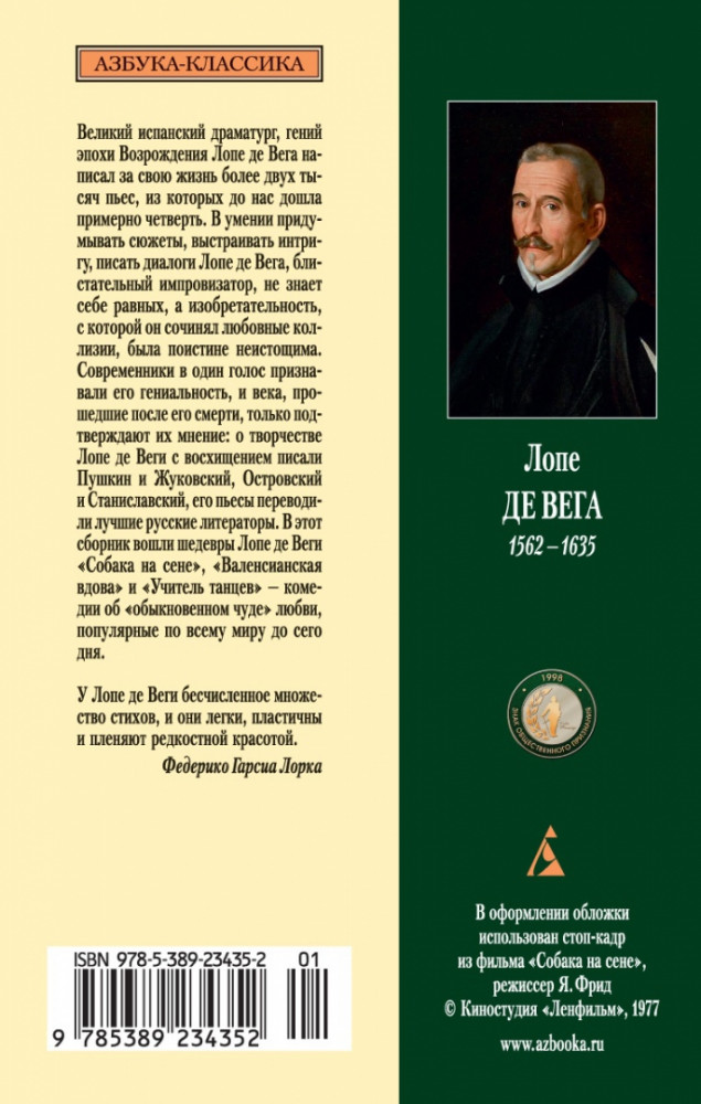 Собака на сене. Валенсианская вдова. Учитель танцевВ данный момент этот товар отсутствует в продаже. Возможно, у нас найдется аналогичный или похожий товар здесь. Серия: Азбука-классика (мягкая обложка) Великий испанский драматург, гений эпохи Возрождения Лопе де Вега написал за свою жизнь более двух тысяч пьес, из которых до нас дошла примерно четверть. В умении придумывать сюжеты, выстраивать интригу, писать диалоги Лопе де Вега, блистательный импровизатор, не знает себе равных, а изобретательность, с которой он сочинял любовные коллизии, была поистине неистощима. Современники в один голос признавали его гениальность, и века, прошедшие после его смерти, только подтверждают их мнение: о творчестве Лопе де Веги с восхищением писали Пушкин и Жуковский, Островский и Станиславский, его пьесы переводили лучшие русские литераторы. В этот сборник вошли шедевры Лопе де Веги «Собака на сене», «Валенсианская вдова» и «Учитель танцев» — комедии об «обыкновенном чуде» любви, популярные по всему миру до сего дня. |
