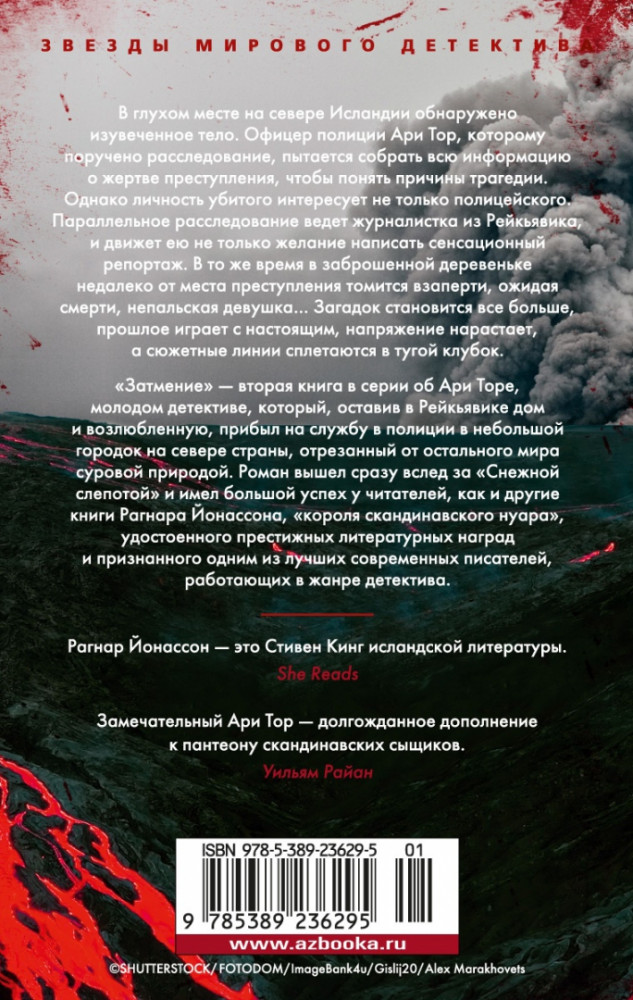 💳 Оплатить за товар можно при получении 🇰🇿 Есть бесплатная доставка по Казахстану от 1 дня 🎁 Копите бонусы с каждой покупки Серия: Звезды мирового детектива (обложка) В глухом месте на севере Исландии обнаружено изувеченное тело. Офицер полиции Ари Тор, которому поручено расследование, пытается собрать всю информацию о жертве преступления, чтобы понять причины трагедии. Однако личность убитого интересует не только полицейского. Параллельное расследование ведет журналистка из Рейкьявика, и движет ею не только желание написать сенсационный репортаж. В то же время в заброшенной деревеньке недалеко от места преступления томится взаперти, ожидая смерти, непальская девушка... Загадок становится все больше, прошлое играет с настоящим, напряжение нарастает, а сюжетные линии сплетаются в тугой клубок. «Затмение» — вторая книга в серии об Ари Торе, молодом детективе, который, оставив в Рейкьявике дом и возлюбленную, прибыл на службу в полиции в небольшой городок на севере страны, отрезанный от остального мира суровой природой. Роман вышел сразу вслед за «Снежной слепотой» и имел большой успех у читателей, как и другие книги Рагнара Йонассона, «короля скандинавского нуара», удостоенного престижных литературных наград и признанного одним из лучших современных писателей, работающих в жанре детектива. |