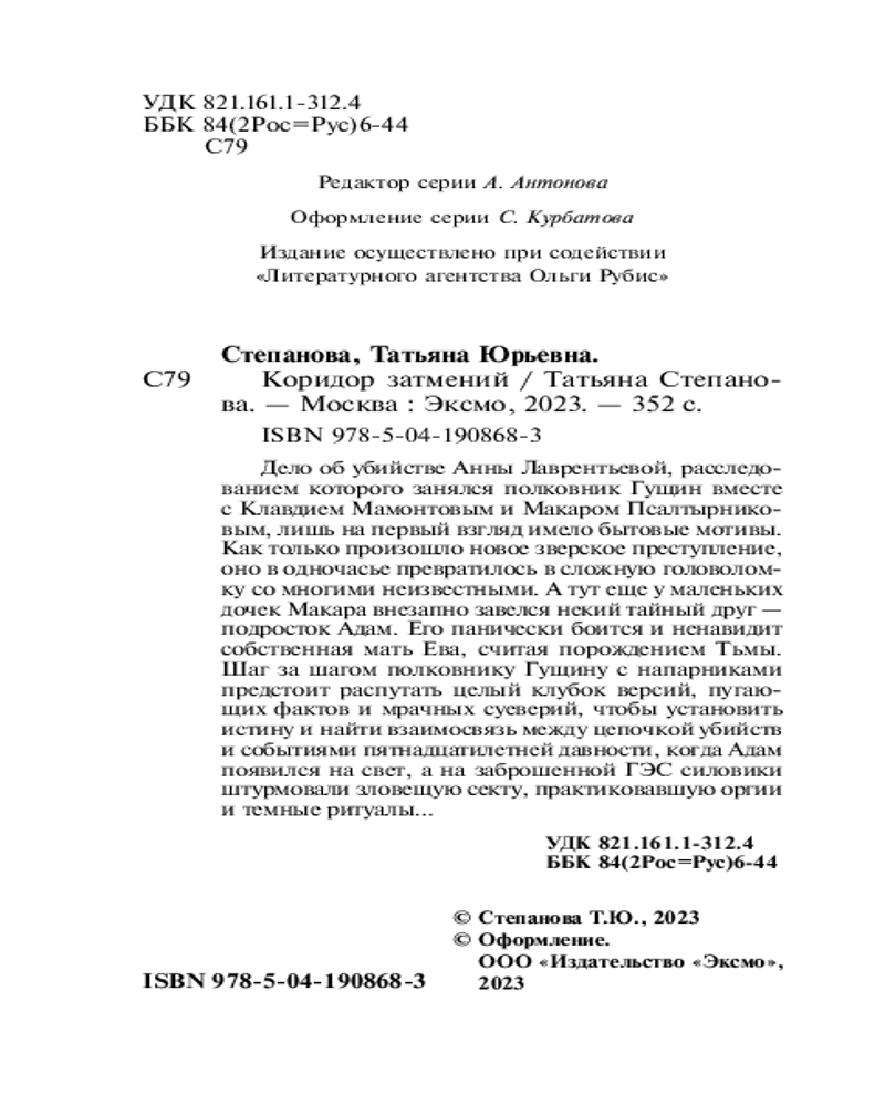 💳 Оплатить за товар можно при получении 🇰🇿 Есть бесплатная доставка по Казахстану от 1 дня 🎁 Копите бонусы с каждой покупки Серия: По следам громких дел. Детективы Т. Степановой. Новое оформление (обложка) Шефу криминальной полиции области полковнику Гущину и его напарникам Клавдию Мамонтову и Макару Псалтырникову предстоит разгадать новую детективно-мистическую головоломку в остросюжетном романе Татьяны Степановой «Коридор затмений». |