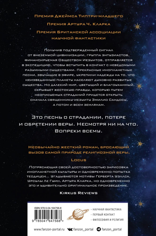 💳 Оплатить за товар можно при получении 🇰🇿 Есть бесплатная доставка по Казахстану от 1 дня 🎁 Копите бонусы с каждой покупки Серия: Fanzon. Sci-Fi Universe. Лучшая новая НФ На плечи Эмилио Сандоса, харизматичного священника-иезуита и лингвиста, ложится ответственная миссия, порученная Обществом Иисуса — установить первый контакт с разумной внеземной цивилизацией. Вместе с астрономом, инженером, врачом, специалистом по компьютерам и тремя другими миссионерами он отправляется на планету Ракхат, но экспедиция, которая была призвана доказать существование Бога во вселенной, заканчивается ужасной катастрофой. |