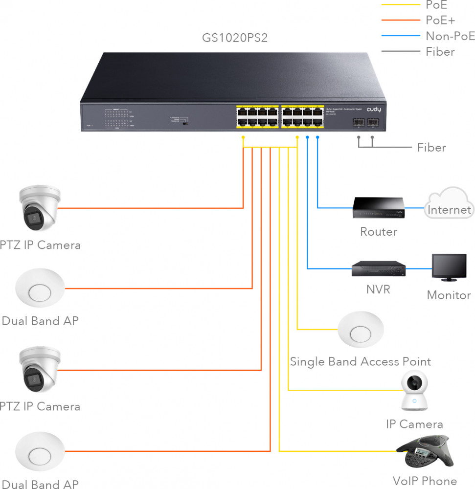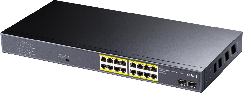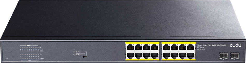 Cudy GS1020PS2 — это гигабитный коммутатор с 16 портами РоЕ/PoE+ и 2 гигабитными SFP оптоволоконными портами для высокоскоростного подключения. Через порты РоЕ передаются и электропитание, и данные к подключенным устройствам. Поддержка стандарта IEEE802.3af/at может обеспечить до 30 Ватт мощности на каждый из 16 портов, суммарно до 200 Вт на все PoE порты. Коммутатор имеет специальный переключатель DIP для выбора режима работы: VLAN, Default или Extend. В режиме VLAN порты 1-16 изолированы друг от друга для повышения безопасности сети (режим изоляции разделяет трафик портов для защиты от постороннего вмешательства и широковещательных штормов). В режиме Default все порты связываются друг с другом в обычном режиме, передача данных и питания на расстояние до 100 метров. В режиме Extend порты 9-16 могут передавать данные и питание на увеличенное расстояние до 250 метров на скорости 10 Мбит/с. Плавная и надёжная передача чувствительного к задержкам трафика (например, видеосвязи или IP телефонии) обеспечивается приоритизацией, гарантируется стабильное питание ключевых устройств и защита от повреждения несовместимых устройств.
