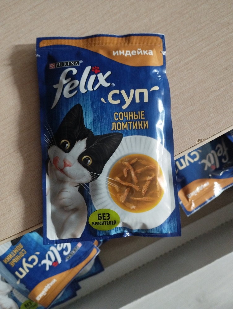 У меня четыре кота, и все обожают эти супы. Дороговато 4 пачки за раз, но балую всеми вкусами. Теперь вместо курицы(всё-таки аллерген для некоторых котов)беру индейку.