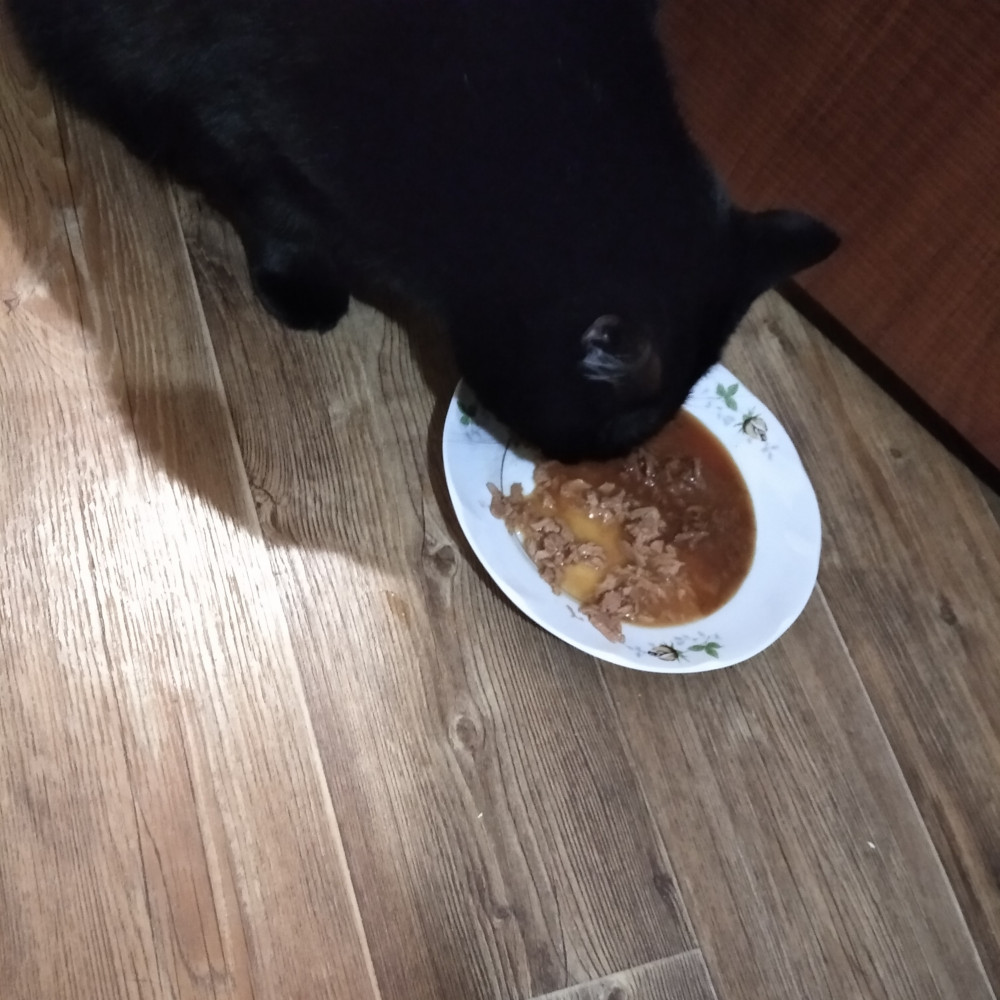 Кошке понравился, жижку точно всю слизала, кусочки остались не доеденными