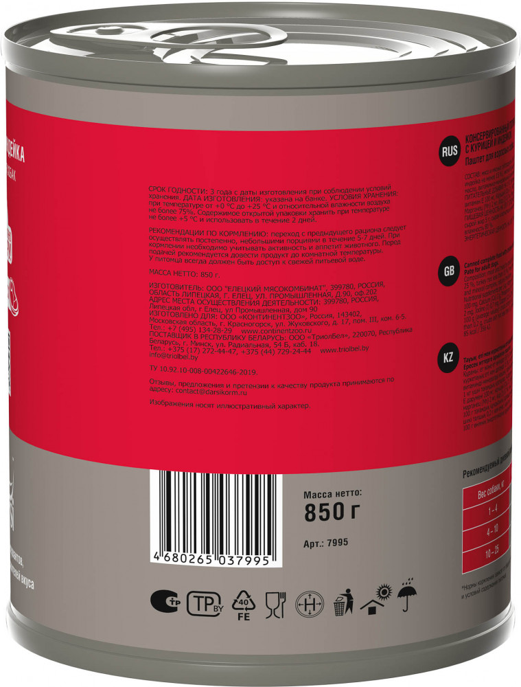 Очень капризному избирательному в еде фокстерьеру корм зашёл.Сначала принюхивался,потом распробовал и баночку потихоньку умял.Корм по консистенции как "завтрак туриста",не мелкий паштет,кусочки печени видно.Заказали ещё другого вида