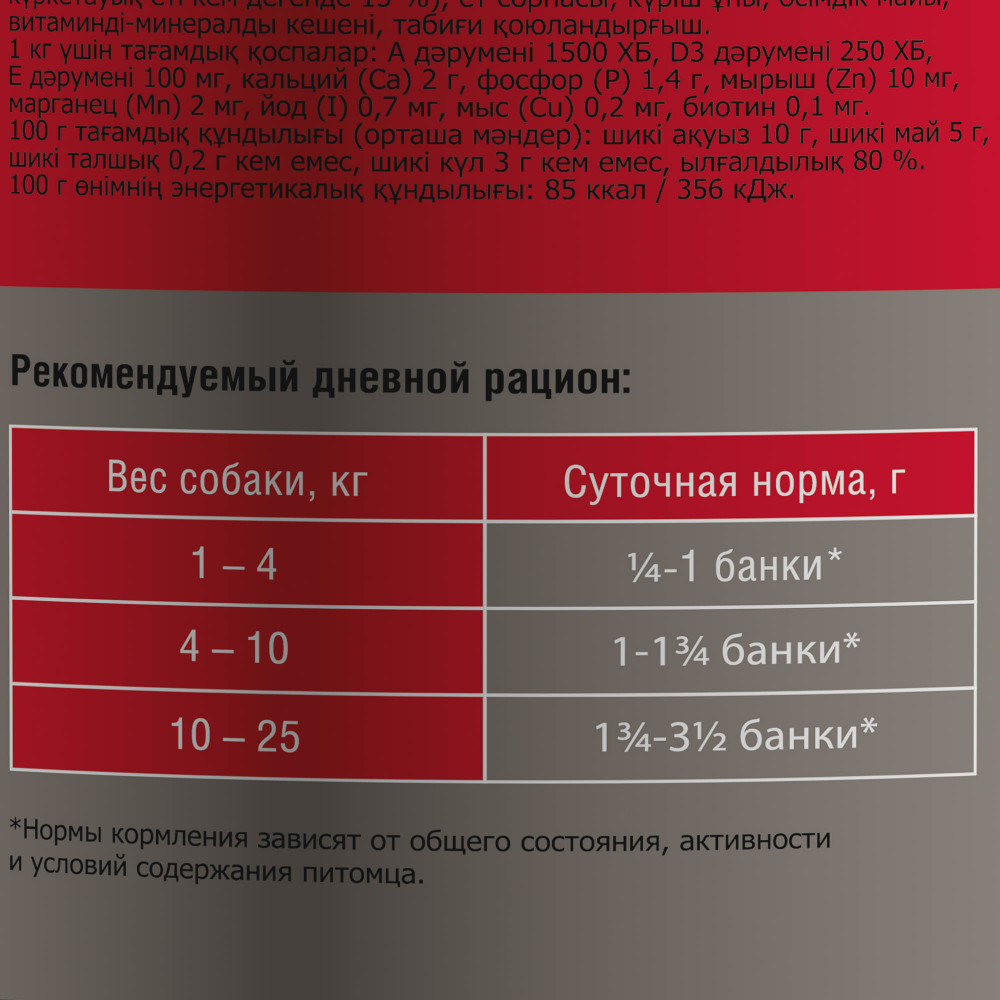 У меня амстафф. Разбавили водичкой содержимое половины банки, использовали, как бульон с мясом. Пёс ел так, что аж за ушами трещало. Банка большая.