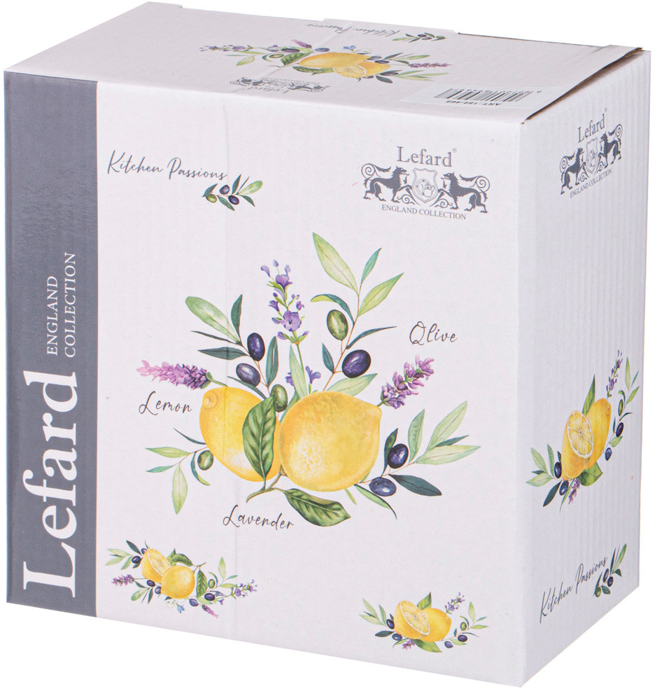 ТМ Lefard предлагает новую коллекцию посуды всем, для кого процесс приготовления стал страстью, кто с удовольствием собирает за своим столом родных и близких и радует их кулинарными шедеврами. Коллекция «Kitchen Passions» — это качественный прочный фарфор, гладкая и сверкающая глазурь, новые рельефные формы, удобные и оптимальные размеры тарелок, салатников, чайных пар, любимые дизайны с изображением лимонов, лаванды, оливок, овощей… Яркая упаковка. Отличный подарок. Все изделия прошли сертификацию, безопасны при контакте с пищевыми продуктами. Можно смело мыть в посудомоечной машине, использовать в микроволновой печи.