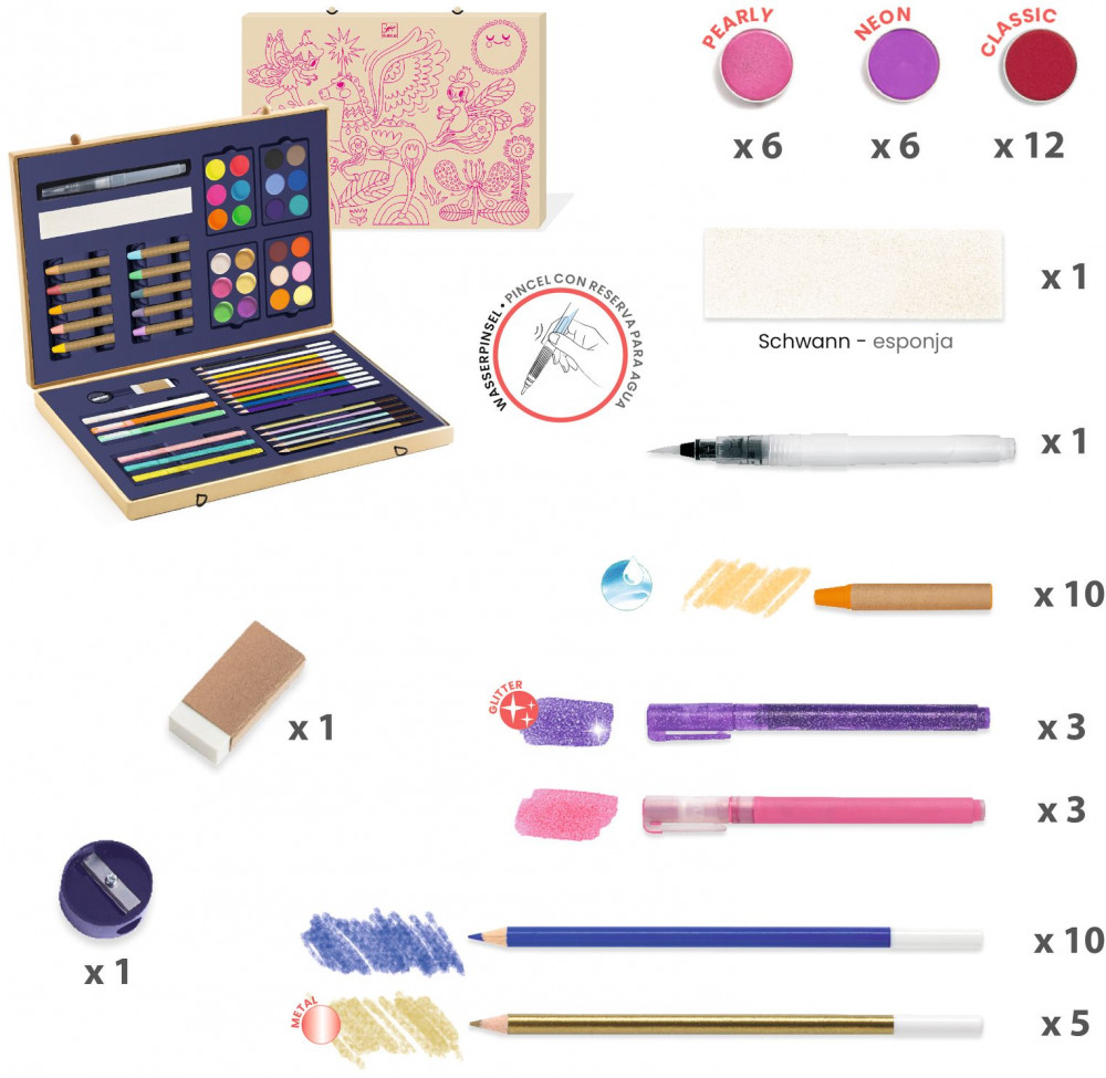 💳 Оплатить за товар можно при получении 🇰🇿 Есть бесплатная доставка по Казахстану от 1 дня 🎁 Копите бонусы с каждой покупки Художественный набор Djeco «Сияющий» для раскрашивания из 60 деталей в красивом деревянном футляре, который очень удобно брать с собой. Такой подарок точно понравится любому юному художнику! Творческие занятия отлично развивают креативное мышление, формируют эстетический вкус и тренируют мелкую моторику ручек. |