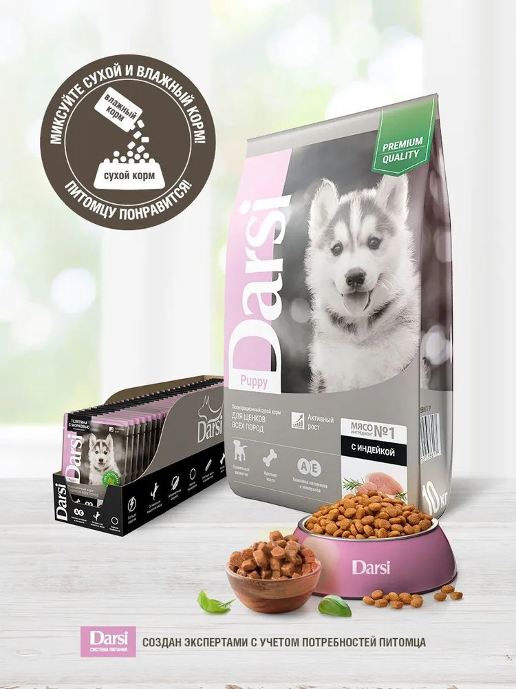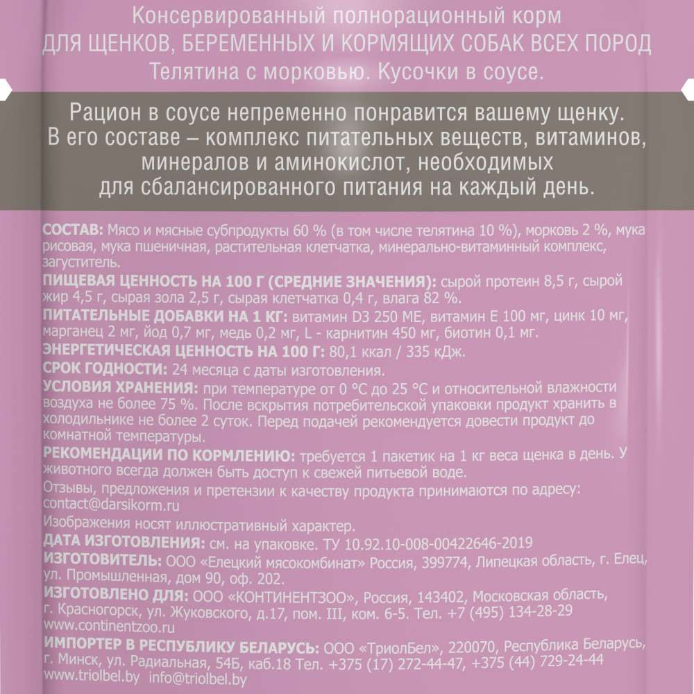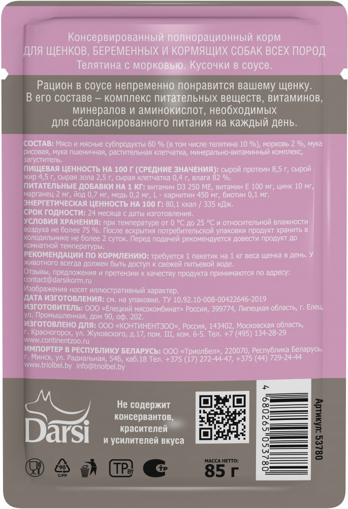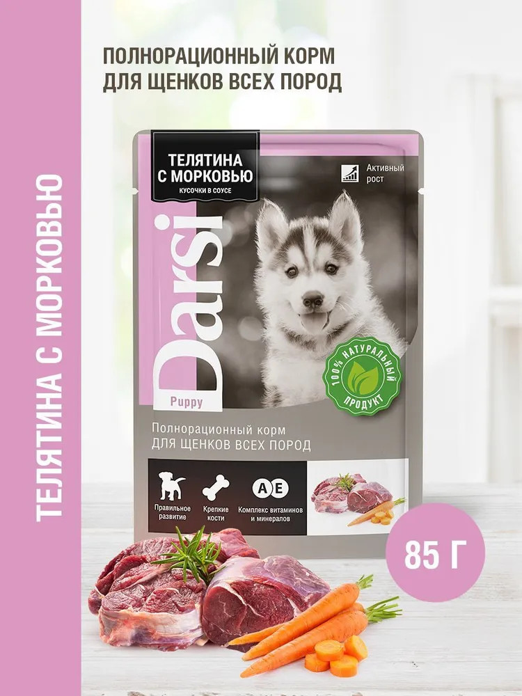 Darsi Корм для щенков всех пород полнорационный «Телятина с морковью. Кусочки в соусе»
