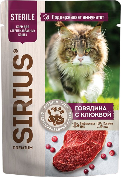 Sirius Корм кусочки в соусе для стерилизованных кошек «Говядина с клюквой»