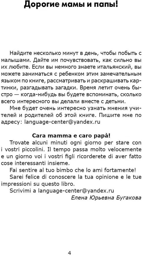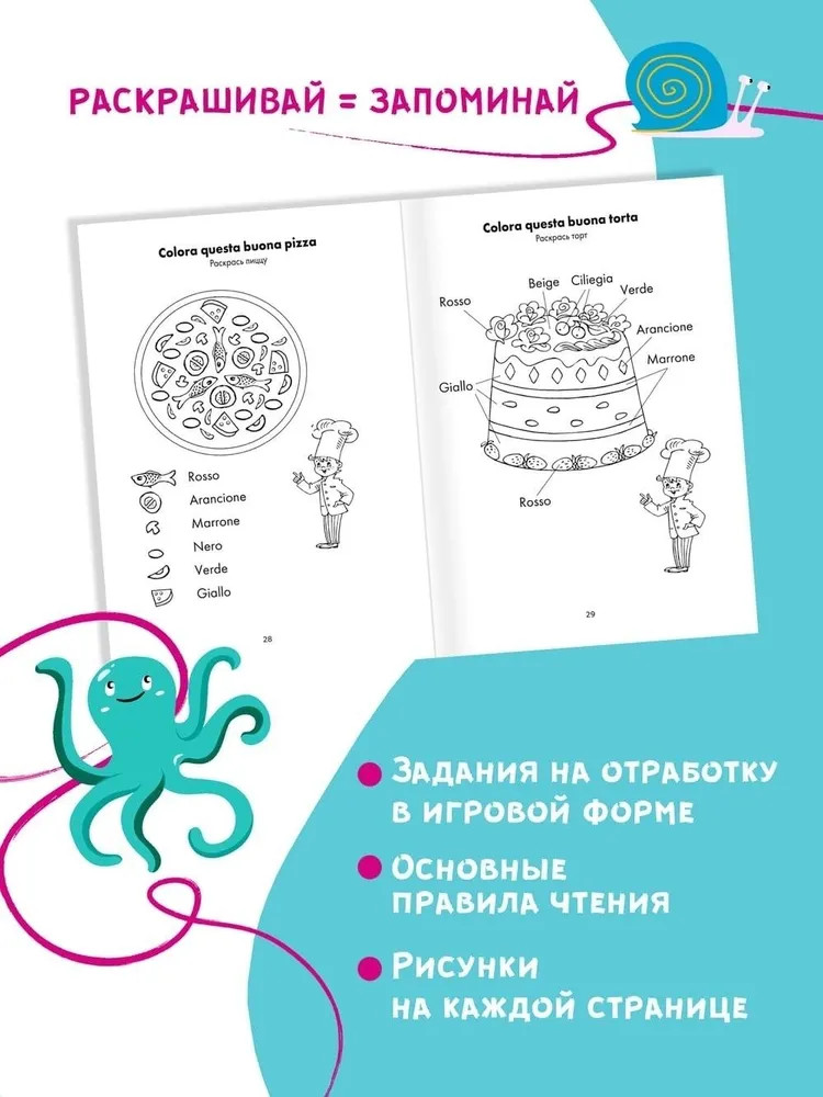 💳 Оплатить за товар можно при получении 🇰🇿 Есть бесплатная доставка по Казахстану от 1 дня 🎁 Копите бонусы с каждой покупки Серия: Для детей Долой скучные уроки! С играми и интересными заданиями учить итальянский язык — весело. Раскрашивание забавных рисунков сделает процесс еще увлекательнее. Играя с итальянскими словами, дети освоят и закрепят базовую лексику по основным темам: семья, животные, цвета, числа... Книга будет полезна для учащихся младших классов, изучающих итальянский язык в школе. А при индивидуальных занятиях — и для дошкольников. |