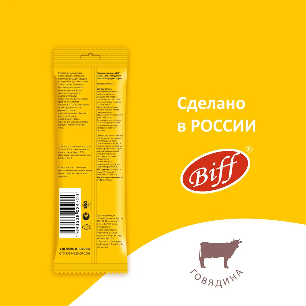 Biff Лакомство жевательное для средних собак с говядиной «Dental care»-20% +18 приятный вкус чистит зубы