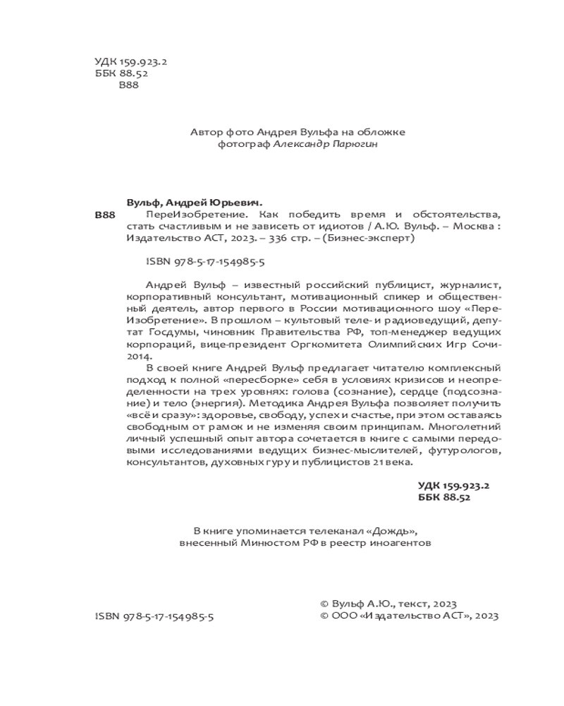 💳 Оплатить за товар можно при получении 🇰🇿 Есть бесплатная доставка по Казахстану от 1 дня 🎁 Копите бонусы с каждой покупки Серия: Бизнес-эксперт Андрей Вульф — известный российский публицист, журналист, корпоративный консультант, мотивационный спикер и общественный деятель, автор первого в России мотивационного шоу «ПереИзобретение». В прошлом — культовый теле- и радиоведущий, депутат Госдумы, чиновник Правительства РФ, топ-менеджер ведущих корпораций, вице-президент Оргкомитета Олимпийских Игр Сочи-2014. |