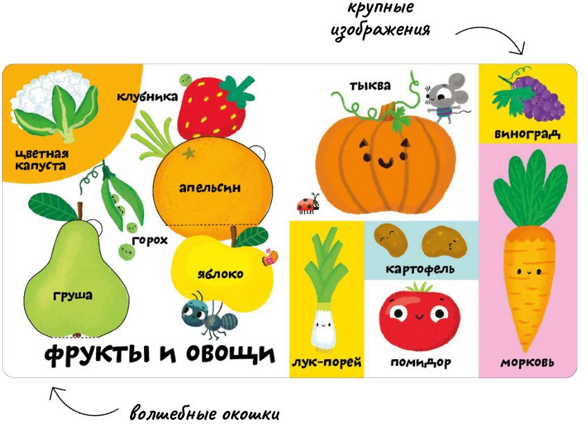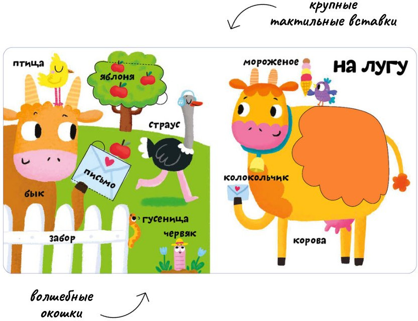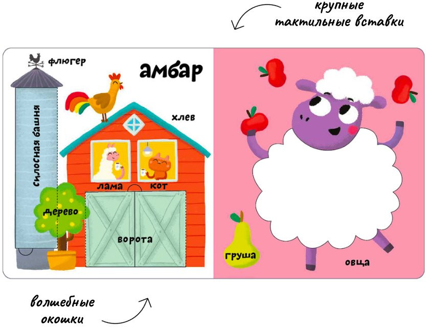 • яркие иллюстрации, тактильные вставки и большие окошки.