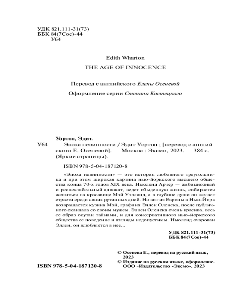 💳 Оплатить за товар можно при получении 🇰🇿 Есть бесплатная доставка по Казахстану от 1 дня 🎁 Копите бонусы с каждой покупки Серия: Яркие страницы «Эпоха невинности» — это история любовного треугольника и при этом широкая картина нью-йоркского высшего общества конца 70-х годов XIX века. Ньюленд Арчер — амбициозный и респектабельный адвокат, ведет обыденную жизнь, собирается жениться на красавице Мэй Уэлланд, а в глубине души он желает страсти среди своих рутинных дней. Но вот из Европы в Нью-Йорк возвращается кузина Мэй, графиня Эллен Оленска, после публичного скандала со своим мужем. Эллен Оленска очень красива, весь ее образ окутан тайнами, и для консервативного нью-йоркского общества ее поведение и взгляды недопустимы. Ньюленд очарован Эллен, он влюбляется в нее... |
