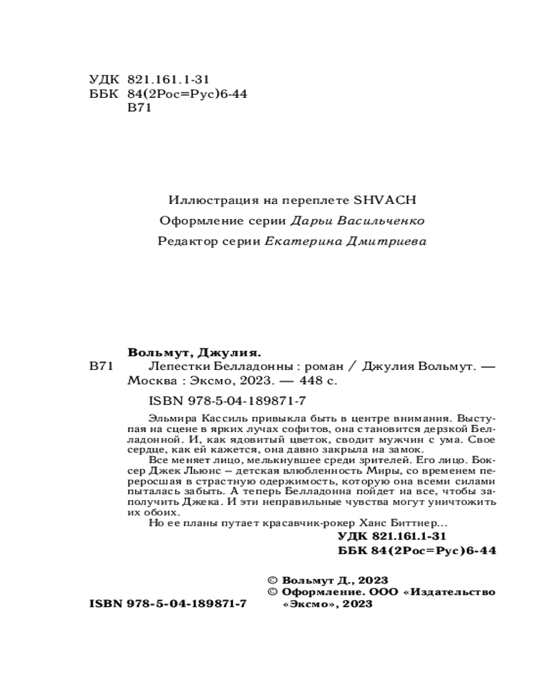 💳 Оплатить за товар можно при получении 🇰🇿 Есть бесплатная доставка по Казахстану от 1 дня 🎁 Копите бонусы с каждой покупки Серия: Обжигающая любовь. Романы Джулии Вольмут «Лепестки Белладонны» — это психологический роман, в котором эмоции искрят будто оголенные нервы. Сквозь боль, непонимание и страхи герои двигаются вперед в надежде получить то, чего хотят, или то, чего думают, что хотят. А мы наблюдаем за ними то с замирающим, то с ускоряющимся пульсом и глотаем страницу за страницей, гадая, куда заведет Белладонну ее одержимость? Это история падения или взлета? |