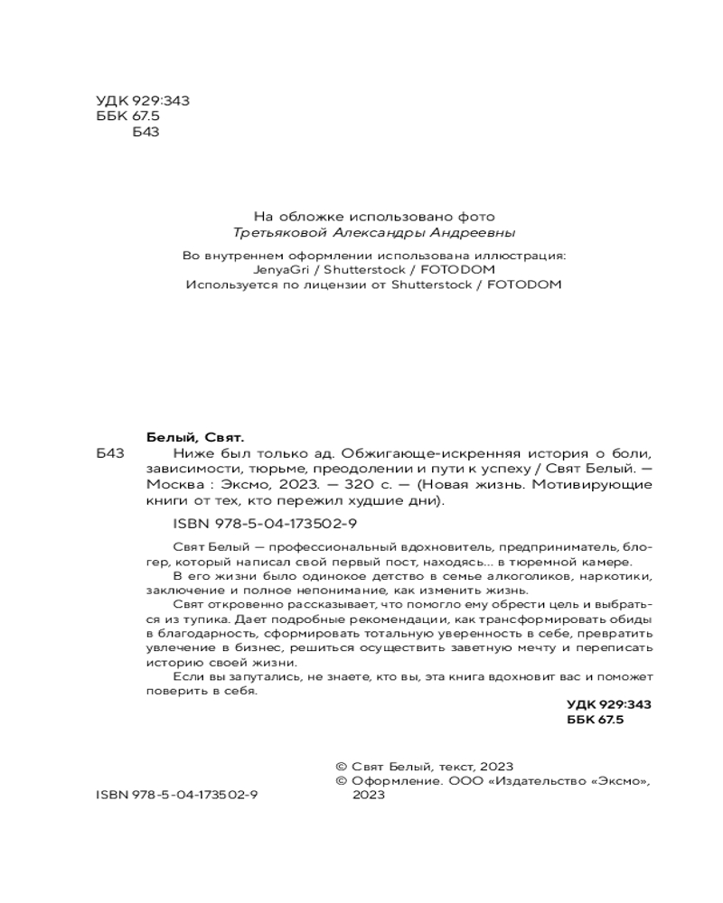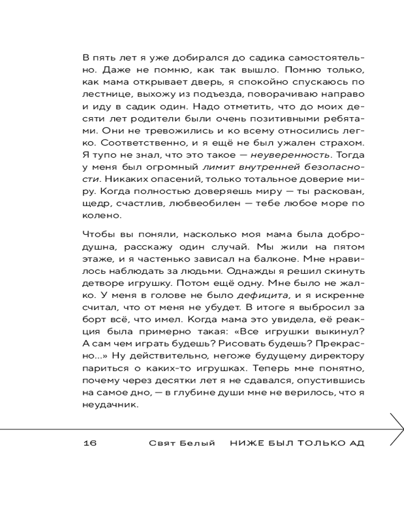 Ниже был только ад. Обжигающе-искренняя история о боли, зависимости, тюрьме, преодолении и пути к успехуВ данный момент этот товар отсутствует в продаже. Возможно, у нас найдется аналогичный или похожий товар здесь. Серия: Новая жизнь. Мотивирующие книги Может ли ребенок из семьи алкоголиков простить ошибки родителей и не повторить их опыт? Способен ли наркоман отказаться от смертельной зависимости? Получится ли вернуть доверие близкого человека, если много раз предавал его? Сумеет ли заключенный осуществить заветную мечту, стать богатым и знаменитым? Мы видим мир согласно нашим убеждениям, и всё, что сегодня кажется невероятным — возможно! Будущее не равно прошлое, есть способ победить любые обстоятельства. |