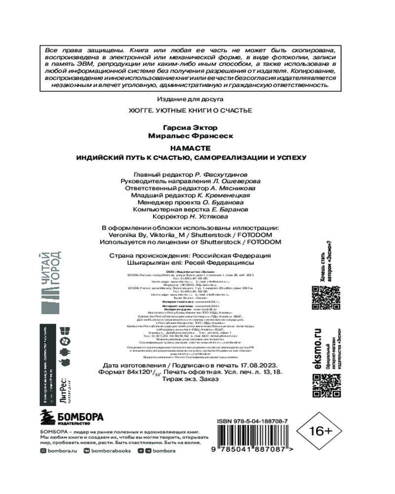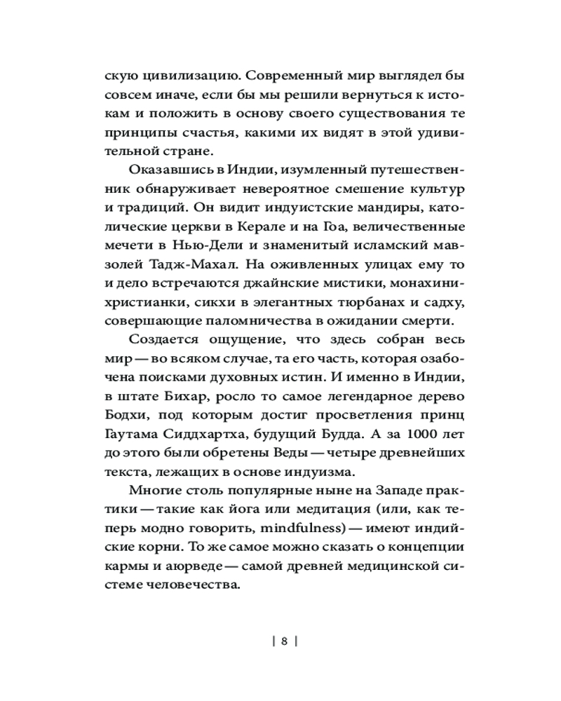 💳 Оплатить за товар можно при получении 🇰🇿 Есть бесплатная доставка по Казахстану от 1 дня 🎁 Копите бонусы с каждой покупки Серия: Хюгге. Уютные книги о счастье Индия ‒ источник всех величайших духовных течений, так или иначе сформировавших человеческую цивилизацию. Современный мир выглядел бы совсем иначе, если бы мы решили вернуться к истокам и положить в основу своего существования те принципы счастья, какими их видят в этой удивительной стране. Авторы бестселлера про феномен «Икигай. Японские секреты долгой и счастливой жизни» Эктор Гарсиа и Франсеска Миральес написали свежую, яркую, отвечающую вызовам современного мира книгу о том, как можно прийти к успеху и процветанию, соединив древние индийские знания с нашим современным представлением о мире. Хотите перестать страдать и начать жить полной жизнью? Заставить законы кармы работать в наших интересах каждый день? Позаботиться о теле, разуме и духе, чтобы энергия наполняла нас до конца наших дней? Тогда эта книга для вас. |