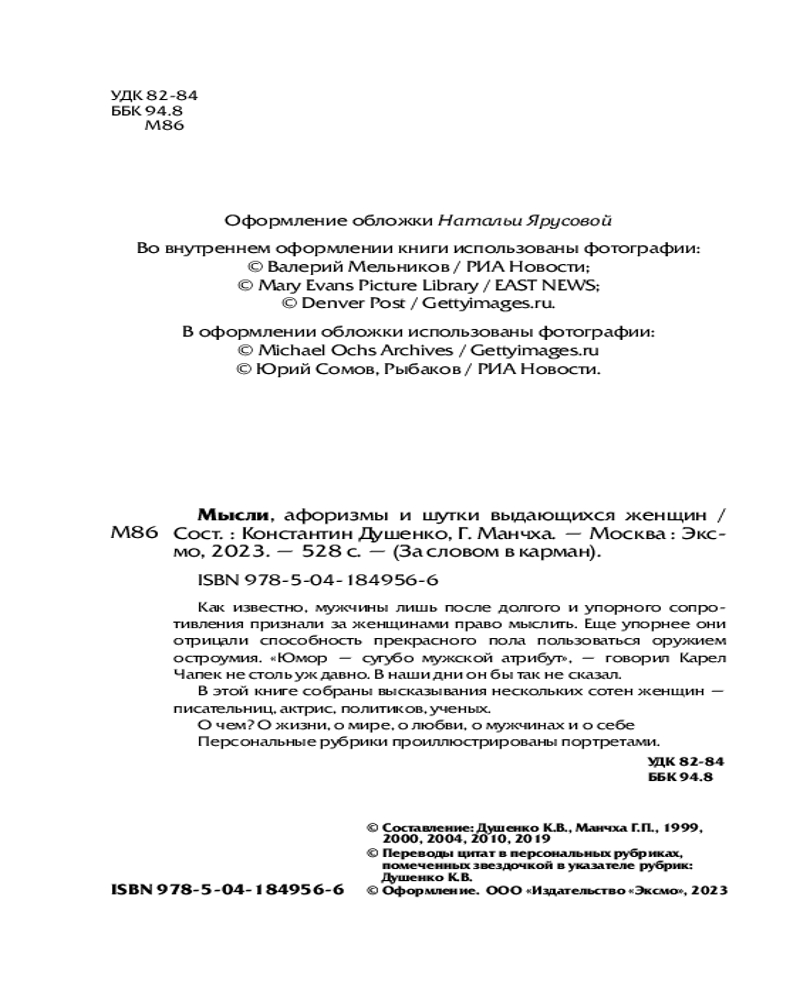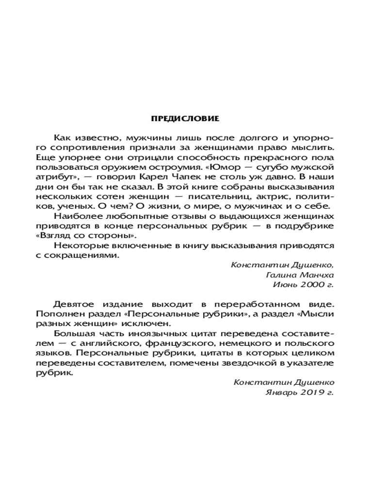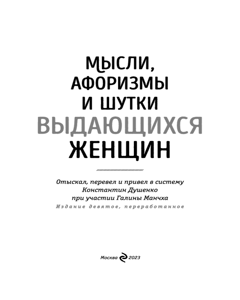 💳 Оплатить за товар можно при получении 🇰🇿 Есть бесплатная доставка по Казахстану от 1 дня 🎁 Копите бонусы с каждой покупки Серия: За словом в карман. Афоризмы. Подарочные издания Как известно, мужчины лишь после долгого и упорного сопротивления признали за женщинами право мыслить. Еще упорнее они отрицали способность прекрасного пола пользоваться оружием остроумия. «Юмор — сугубо мужской атрибут», — говорил Карел Чапек не столь уж давно. В наши дни он бы так не сказал. В этой книге собраны высказывания нескольких сотен женщин — писательниц, актрис, политиков, ученых. О чем? О жизни, о мире, о любви, о мужчинах и о себе. Персональные рубрики проиллюстрированы портретами. |