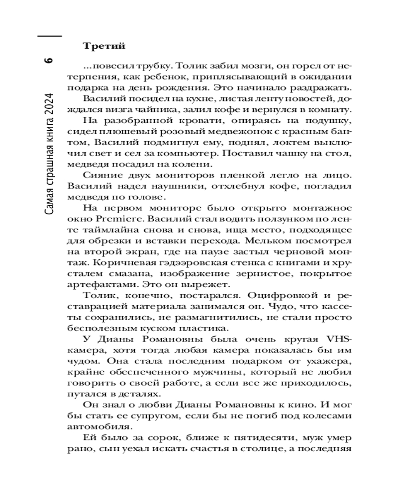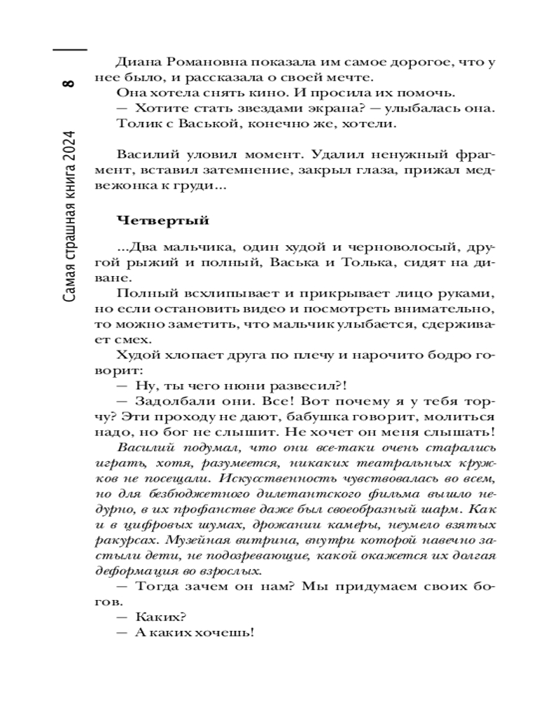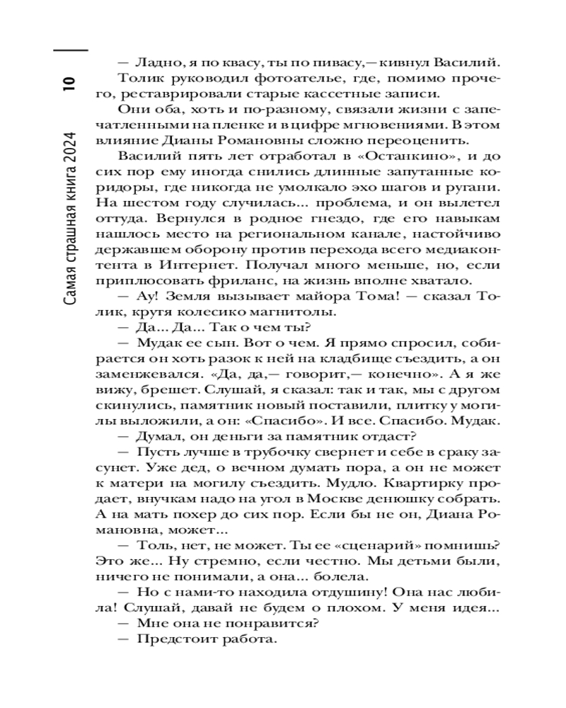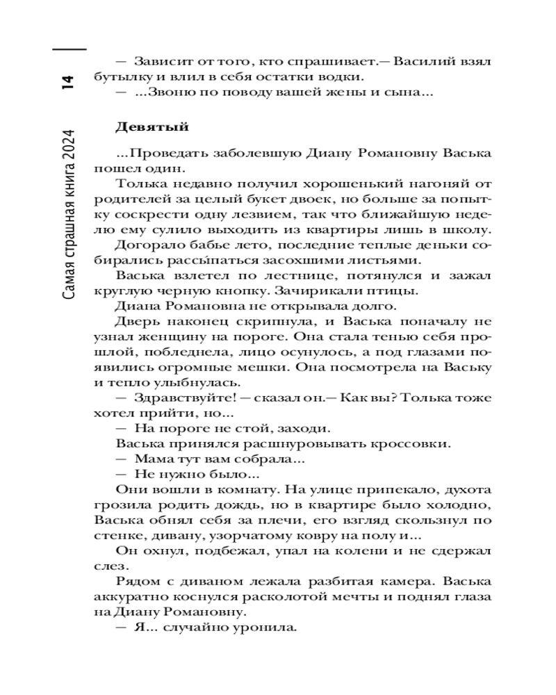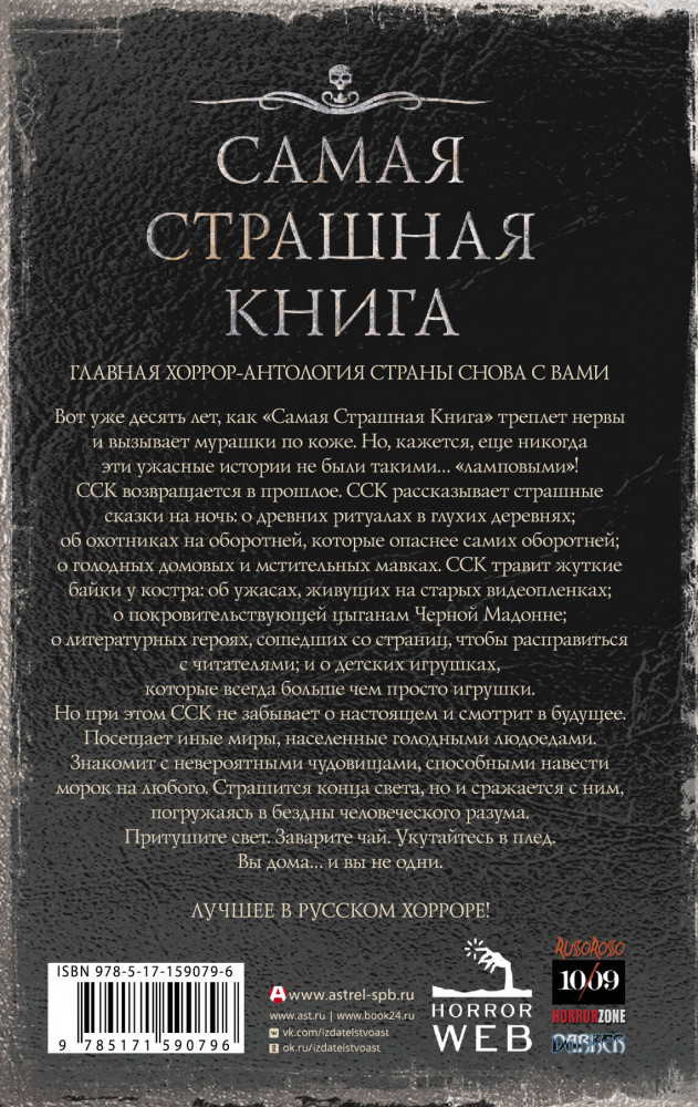 Самая страшная книга 2024В данный момент этот товар отсутствует в продаже. Возможно, у нас найдется аналогичный или похожий товар здесь. Серия: Самая страшная книга Главная хоррор-антология страны снова с вами. Вот уже десять лет, как «Самая Страшная Книга» треплет нервы и вызывает мурашки по коже. Но, кажется, еще никогда эти ужасные истории не были такими... «ламповыми»! ССК возвращается в прошлое. ССК рассказывает страшные сказки на ночь: о древних ритуалах в глухих деревнях; об охотниках на оборотней, которые опаснее самих оборотней; о голодных домовых и мстительных мавках. ССК травит жуткие байки у костра: об ужасах, живущих на старых видеопленках; о покровительствующей цыганам Черной Мадонне; о литературных героях, сошедших со страниц, чтобы расправиться с читателями; и о детских игрушках, которые всегда больше, чем просто игрушки. |