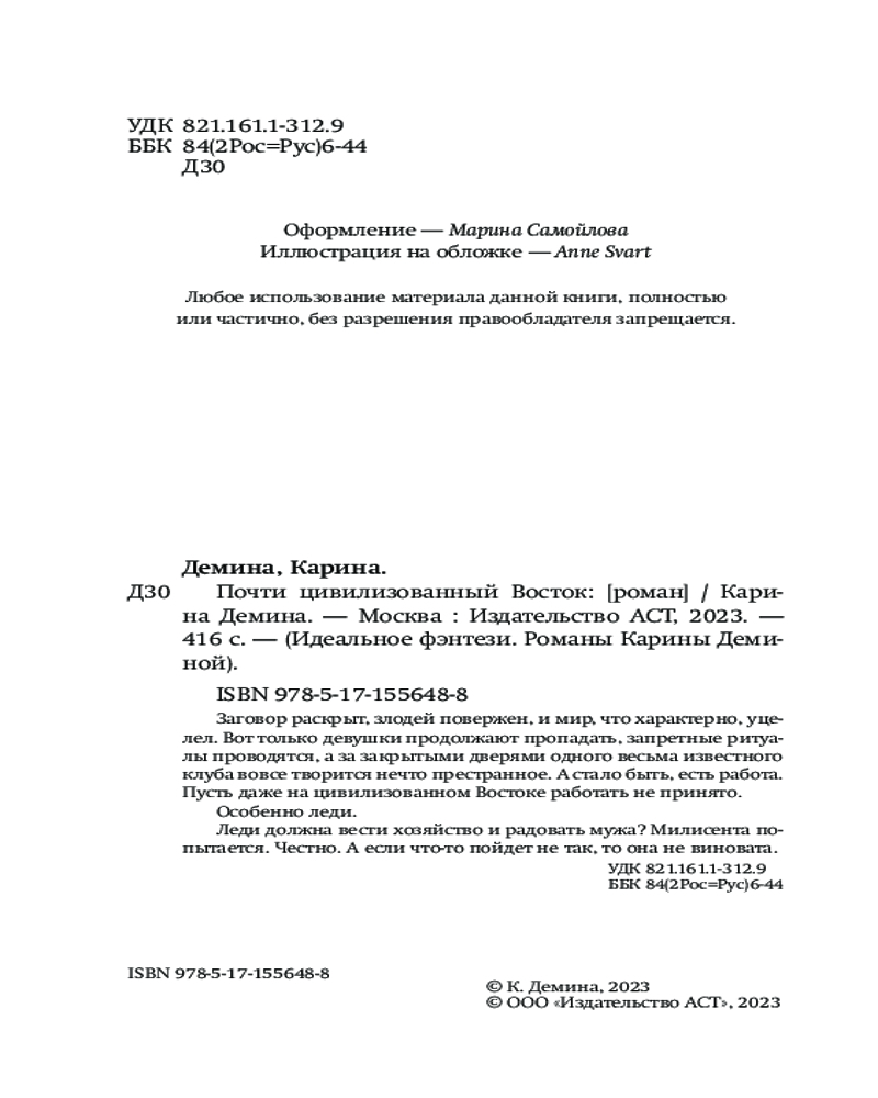 💳 Оплатить за товар можно при получении 🇰🇿 Есть бесплатная доставка по Казахстану от 1 дня 🎁 Копите бонусы с каждой покупки Серия: Идеальное фэнтези. Романы Карины Деминой Заговор раскрыт, злодей повержен, и мир, что характерно, уцелел. Вот только девушки продолжают пропадать, запретные ритуалы проводятся, а за закрытыми дверями одного весьма известного клуба вовсе творится нечто престранное. А стало быть, есть работа. Пусть даже на цивилизованном Востоке работать не принято. |
