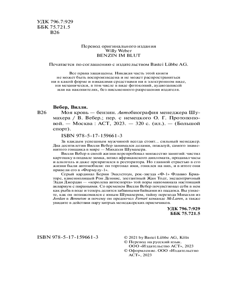 | Вилли Вебер — менеджер самого титулованного автогонщика современности Михаэля Шумахера. Его автобиография — вдохновляющий, но тернистый путь человека к мечте. Вспоминая события своей жизни и давая им честную оценку, Вилли Вебер раскрывает свое истинное лицо, скрытое под маской успешного менеджера. Книга обнажает «теневую сторону» мира гонок и полна подробностей из жизни и профессиональной карьеры Шумахера. Впервые поклонники автоспорта узнают подлинную историю самого успешного дуэта в мире... |
