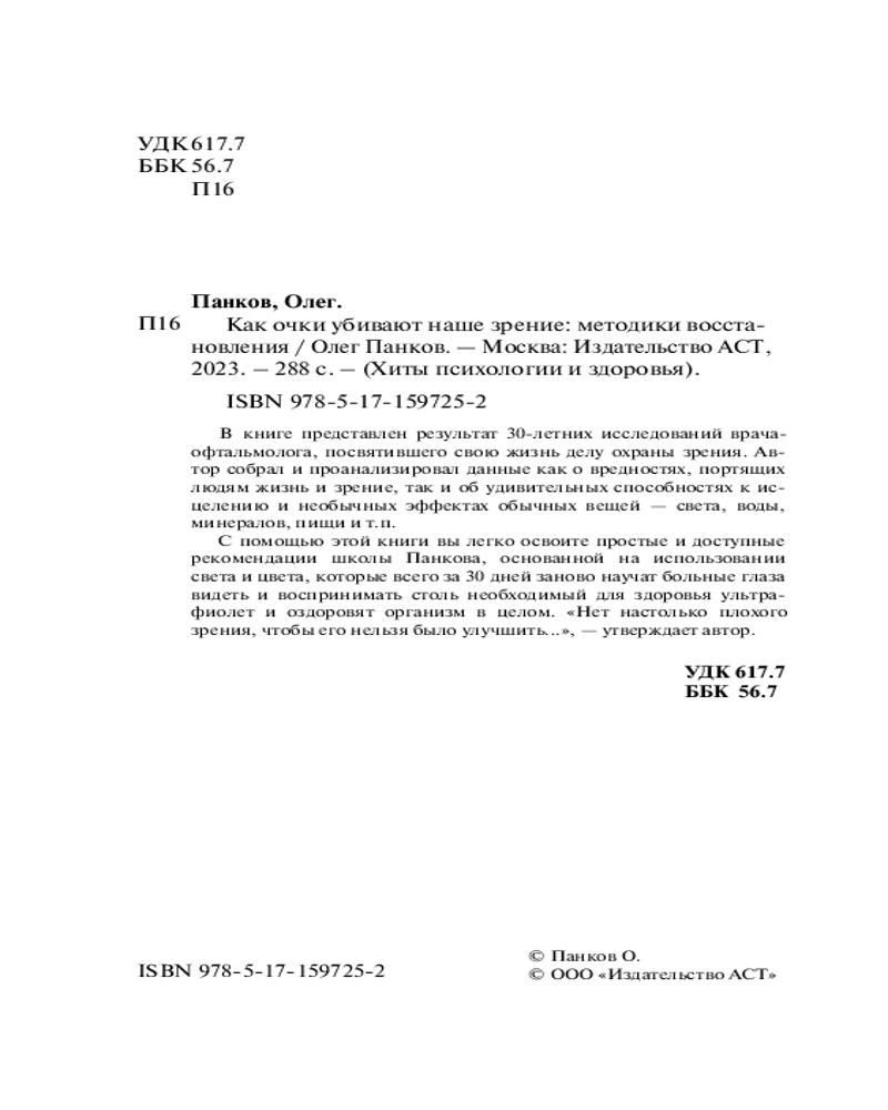 💳 Оплатить за товар можно при получении 🇰🇿 Есть бесплатная доставка по Казахстану от 1 дня 🎁 Копите бонусы с каждой покупки Серия: Хиты психологии и здоровья В книге представлен результат 30-летних исследований врача-офтальмолога, посвятившего свою жизнь делу охраны зрения. Автор собрал и проанализировал данные как о вредностях, портящих людям жизнь и зрение, так и об удивительных способностях к исцелению и необычных эффектах обычных вещей — света, воды, минералов, пищи и т.п. |