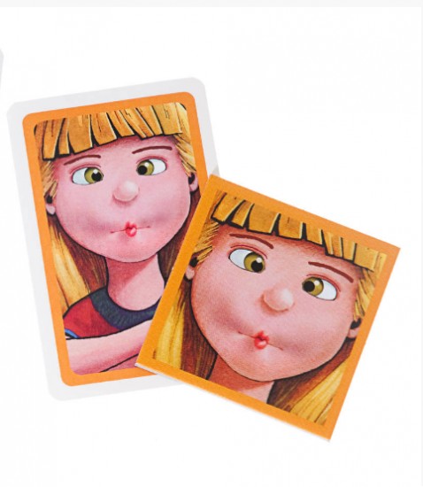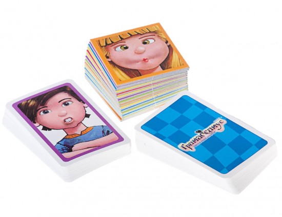 Интересная игра. Дочке 4 года, играла с удовольствием. На поле раскладываются карточки с изображением различных гримас. Посередине выкладываются в стопку фишки с такими же изображениями, обратной стороной. По очереди берется фишка и зеркало. Не показывая сопернику фишку, смотря в зеркало изображаешь гримасу, как на картинке. Соперник смотрит на поле с карточками и должен угадать, какую именно гримасу ты изображаешь.