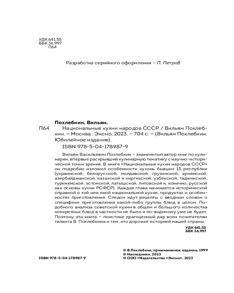 Национальные кухни народов СССРВ данный момент этот товар отсутствует в продаже. Возможно, у нас найдется аналогичный или похожий товар здесь. Серия: Вильям Похлебкин. Юбилейное издание Тюри, окрошки, ботвиньи, щи, уха, рассольник, солянка, каши, блины, пироги, коврижки, куличи, медок, сбитень, квас — это только рецепты русской кухни в книге «Национальные кухни народов СССР». А в ней еще 14 кухонь: украинская, белорусская, молдавская, грузинская, армянская, азербайджанская, казахская, киргизская, туркменская, таджикская, узбекская, эстонская, латышская, литовская. История приготовления блюд, национальные особенности, время, посуда, продукты — обо всех тонкостях каждой из них подробно рассказано великим В. В. Похлебкиным, национальной гордостью России в области кулинарного искусства. Ведь главные отличия национальных кухонь заключаются не в том, что или из чего готовят, а каким образом, с помощью каких приемов, в какой культурной среде. Именно эти детали, эти технологические «мелочи» являются основными для формирования особого вкуса блюд. Вот почему крайне важно, читая рецепты и комментарии этого удивительного автора, обращать внимание на описание подготовки продуктов и технологию их приготовления, на особые методы и приемы кулинарной обработки, которые зачастую являются более важным условием успеха, чем состав продуктов. |