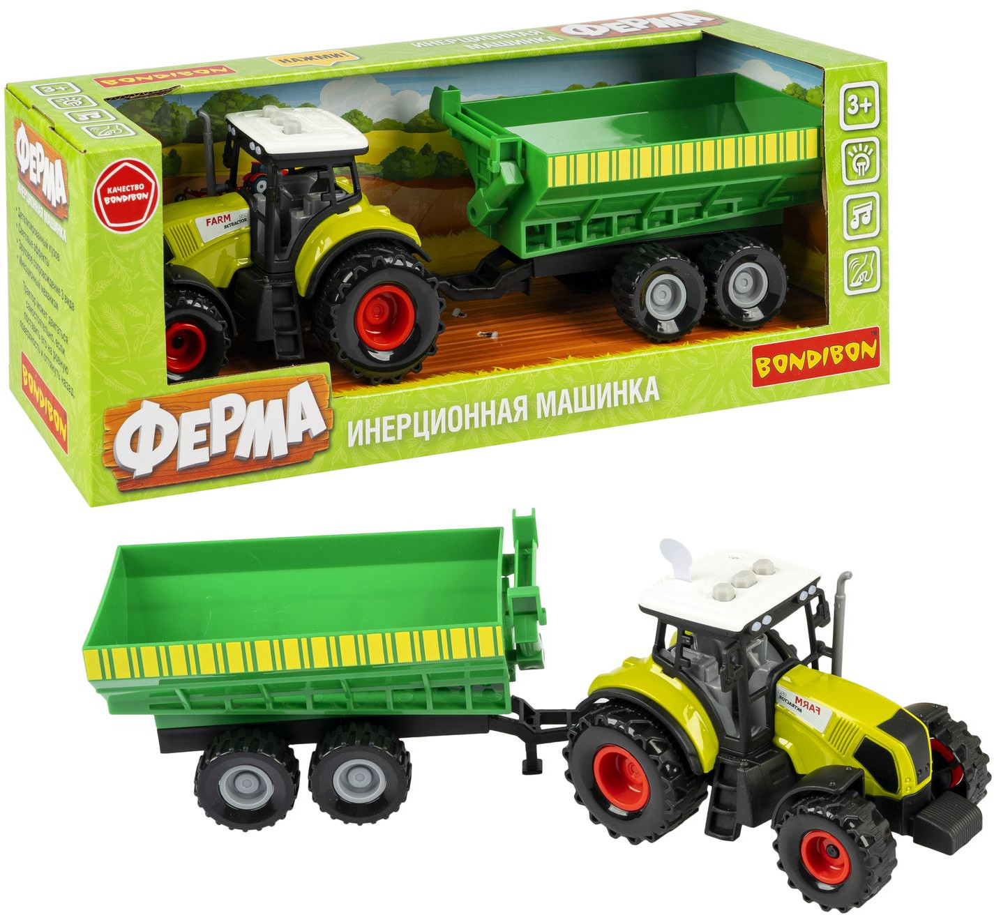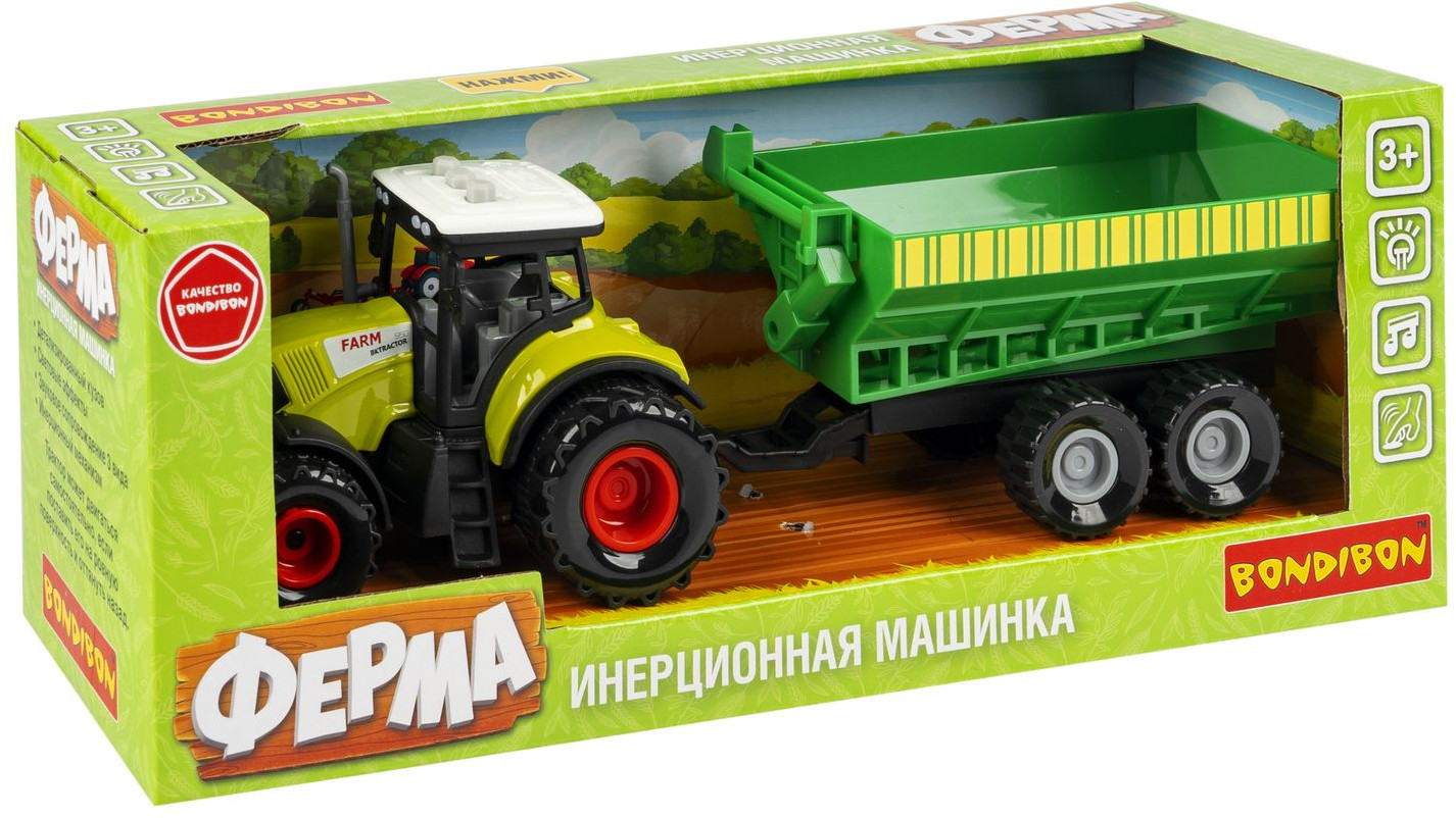Bondibon Трактор инерционный с прицепомВ данный момент этот товар отсутствует в продаже. Возможно, у нас найдется аналогичный или похожий товар здесь. Серия: Сельское хозяйство Порадуйте ребенка инерционной сельскохозяйственной машиной с прицепом зеленого цвета от Bondibon. Яркий трактор со светом, звуком и детализированным кузовом надолго увлечет детей. Уберите ограничитель для батареек и начните веселую игру. |