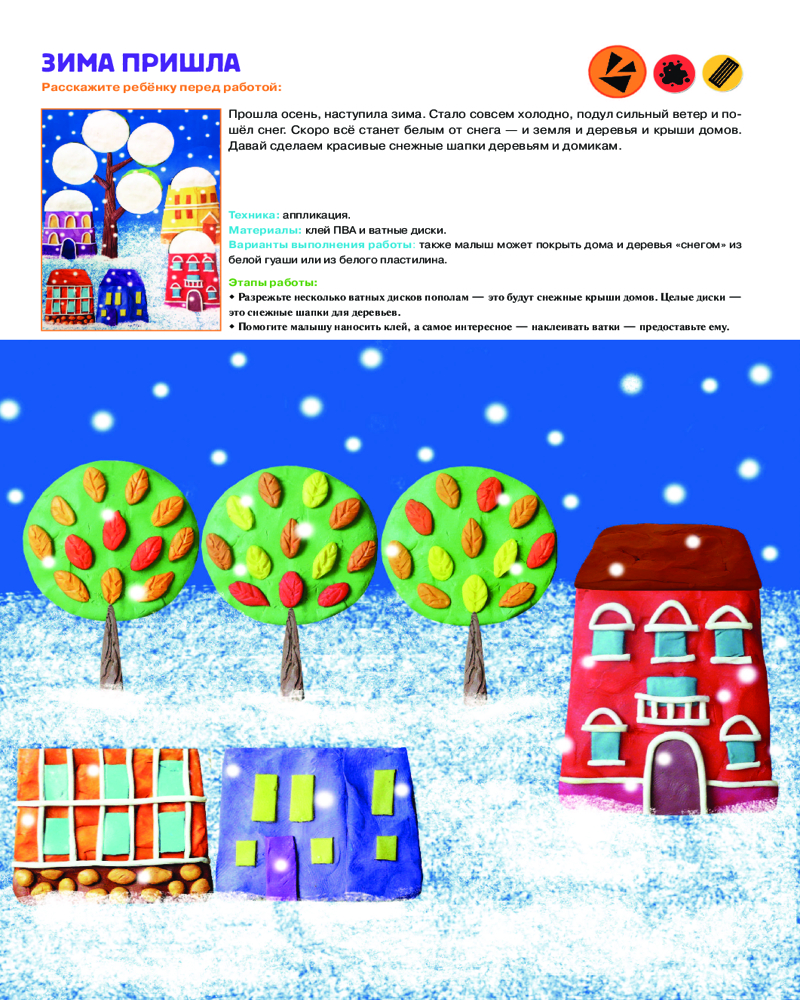 В пособии собраны все развивающие творческие техники для самых маленьких: простая аппликация, рисование ладошками, ножками, пластилином, пальчиками, кисточкой и восковыми мелками.