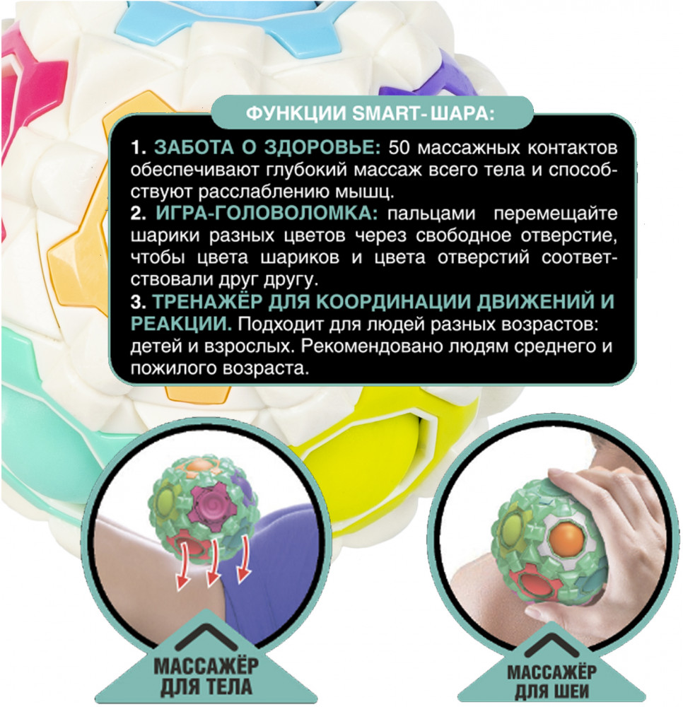 Играя, развивайте внимание, концентрацию, логическое и пространственное мышление. Сделайте глубокий массаж тела и шеи. 50 массажных контактов способствуют расслаблению мышц. А еще «Smart шар» от Бондибон — отличный тренажер координации движений и реакции у людей среднего и пожилого возраста. Такой яркий, стильный, интересный и полезный подарок порадует не только детей, родителей, но и бабушку с дедушкой!