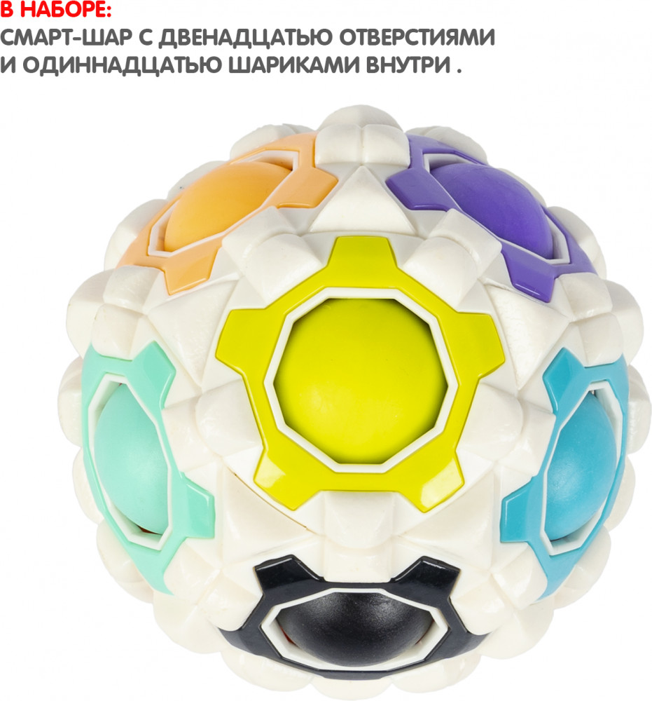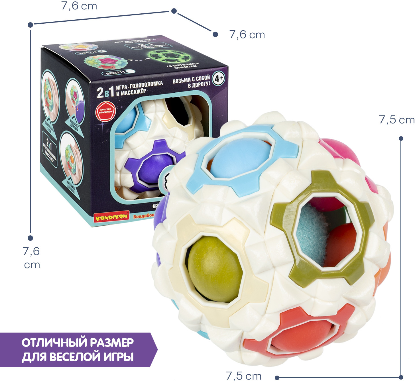 Белый «Smart шар» 2 в 1 от Bondibon — это увлекательная головоломка и замечательный массажер для маленьких и взрослых. Тренируйте ум и заботьтесь о здоровье везде, где хочется! Ведь компактную игру диаметром 7,5 см удобно брать с собой в дорогу. Разгадывайте захватывающую головоломку. Пальцами перемещайте шарики разных цветов через свободное отверстие, чтобы цвета шариков соответствовали цвету отверстий. Если Вы справились с заданием, перемешайте все вновь для следующей попытки.