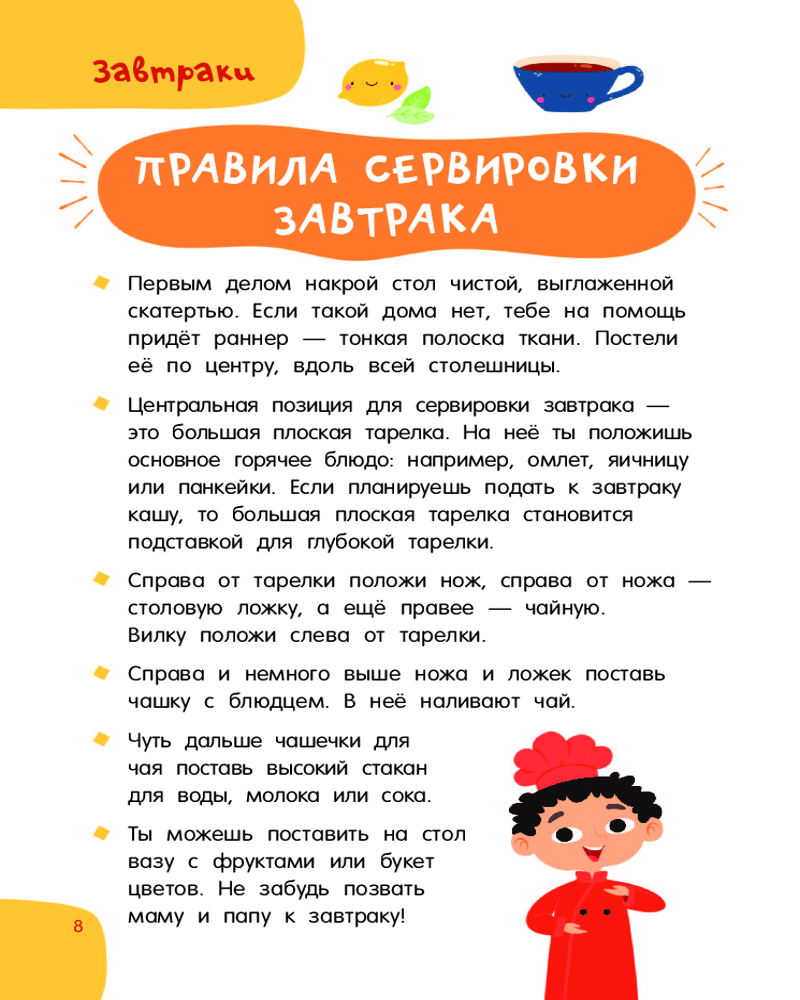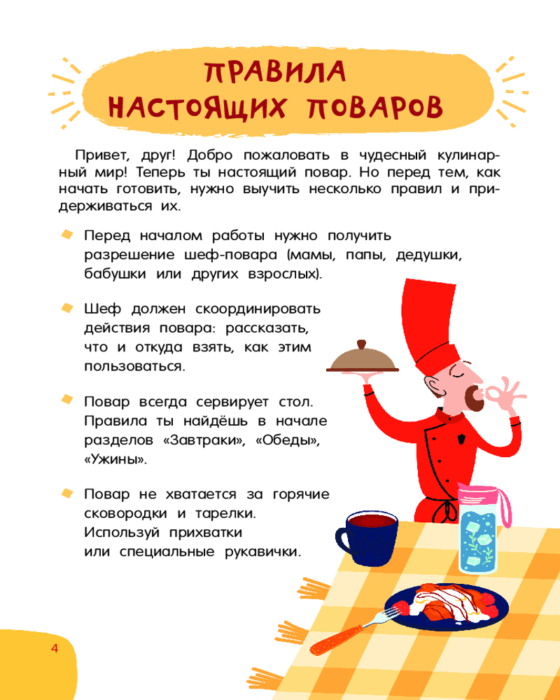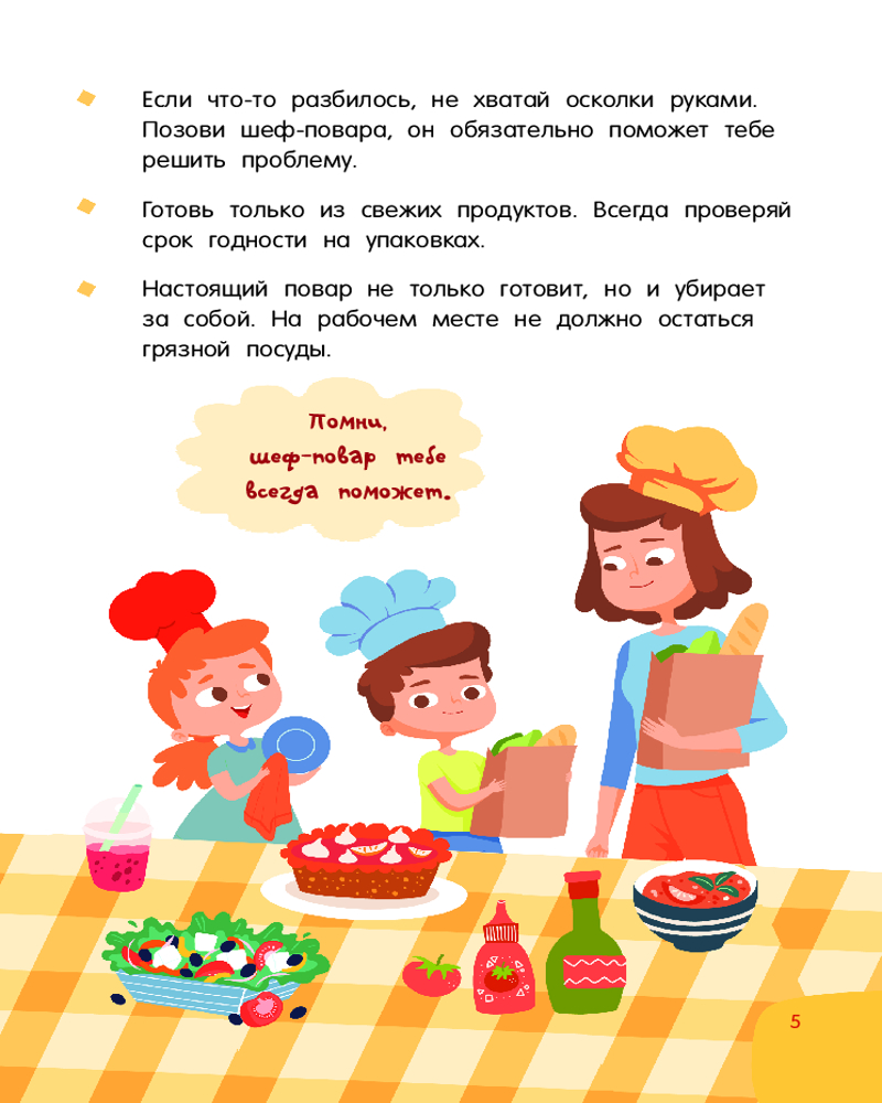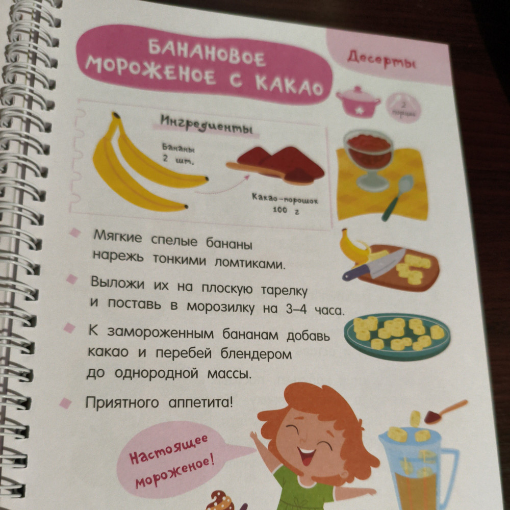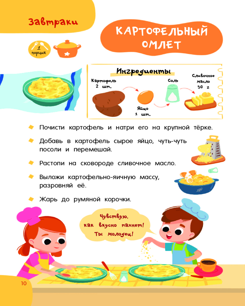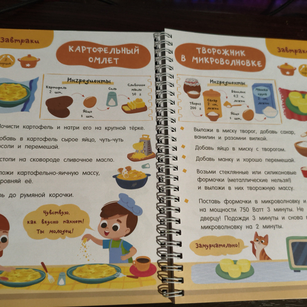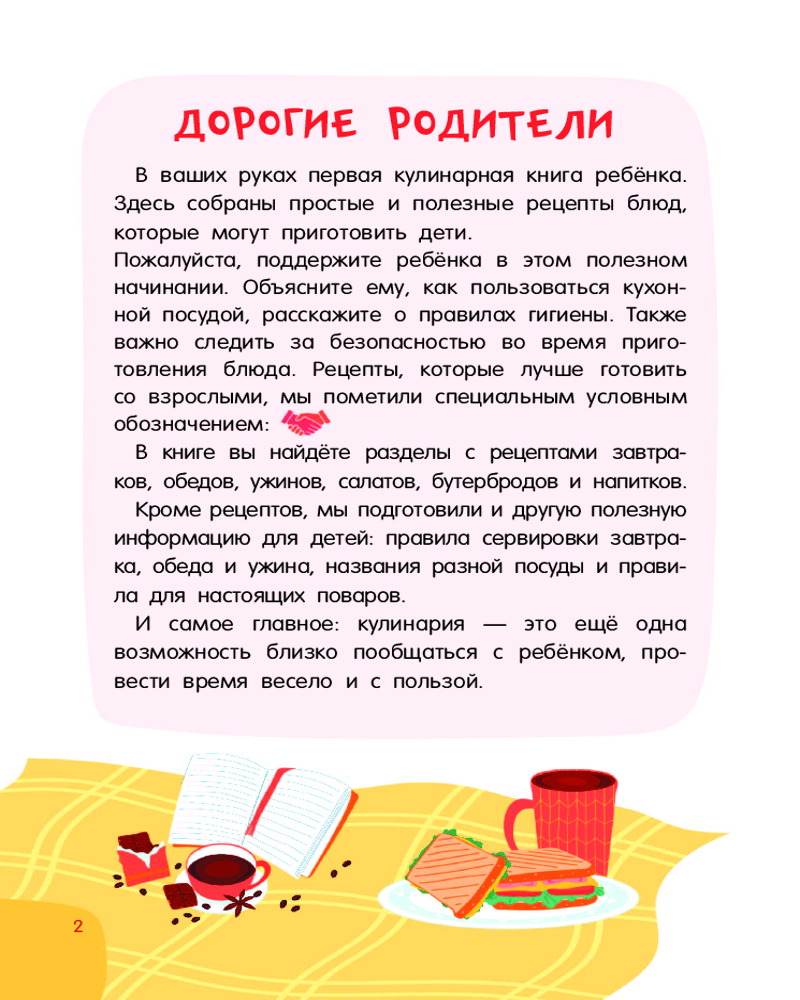 💳 Оплатить за товар можно при получении 🇰🇿 Есть бесплатная доставка по Казахстану 🎁 Копите бонусы с каждой покупки Серия: Просто удобно: книга на спирали «Первая кулинарная книга: готовлю сам без мамы» — настоящая находка для юных шеф-поваров и их родителей. Это небольшая и удобная книга на спирали, которой легко пользоваться на кухне — выбираешь рецепт, загибаешь страничку, и тебе ничего не мешает! Под обложкой более 60 разнообразных рецептов с пошаговым описанием: завтраки, обеды, ужины, десерты, бутерброды, салаты, напитки и многое другое. Понятные ребенку единицы измерения — стакан, чайная ложка. Яркие иллюстрации, выполненные в стиле современных мультфильмов. |