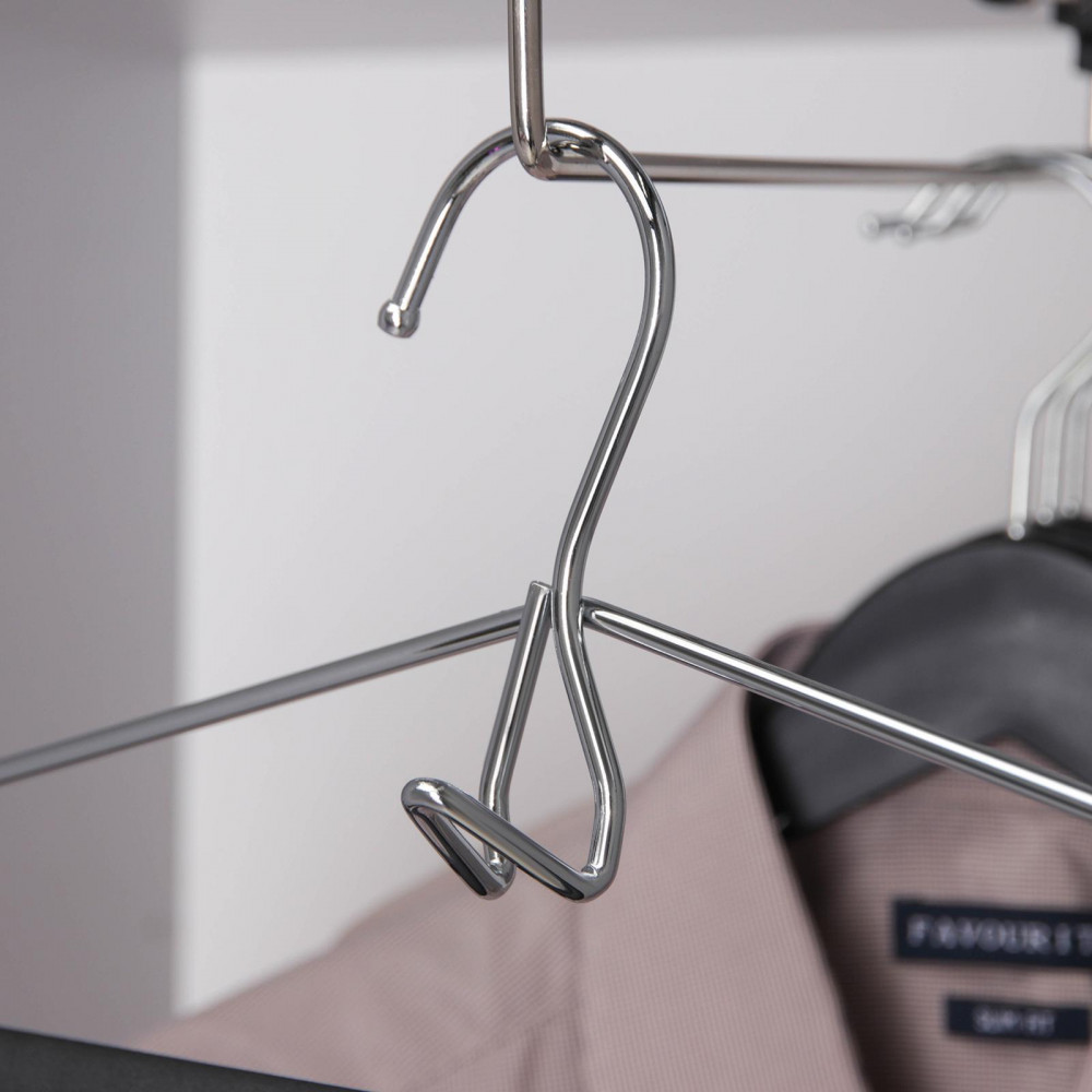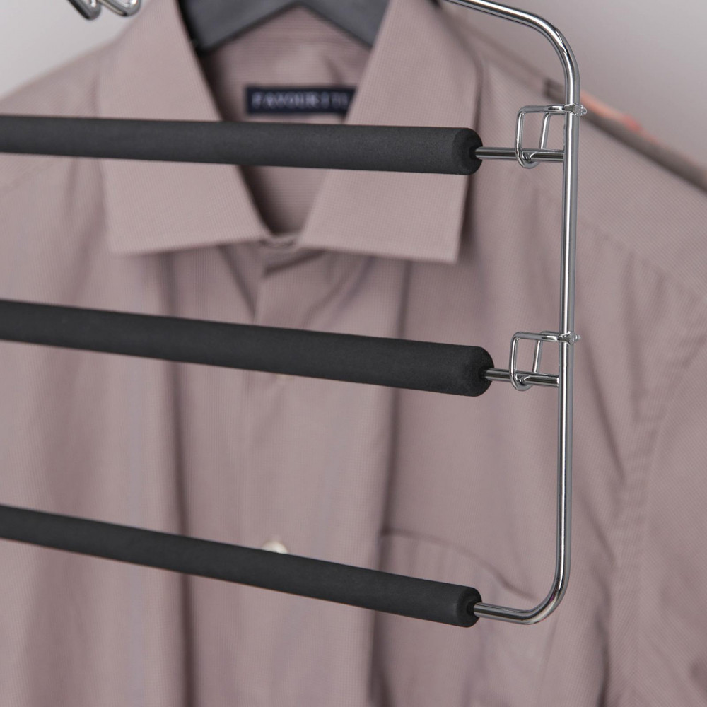 Удобная вешалка для брюк, антискользящее покрытие. Можно поперечную рейку достать из замка, повернуть и снять или повесить брюки без труда.