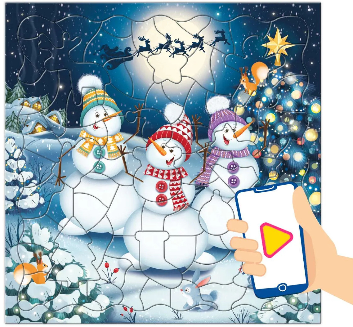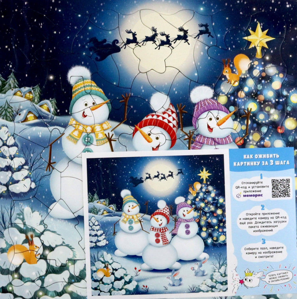 Снеговики готовы встречать Новый год! А ты? Правильно сложи все фрагменты — и увидишь их весёлый танец! Отсканируй QR-код, наведи камеру на изображение — и картинка со звуком оживёт! Элементы пазла — ёлка, ёлочные украшения и, конечно, сладости для главного зимнего праздника! Рассматривай детали, играй и собирай красочную картинку.
