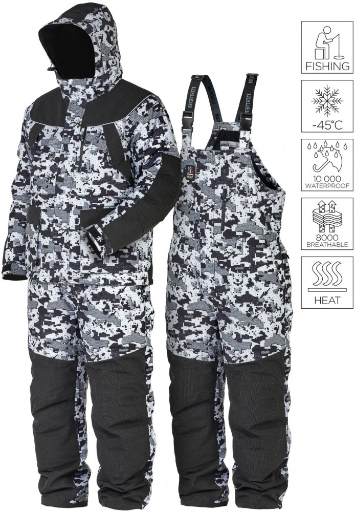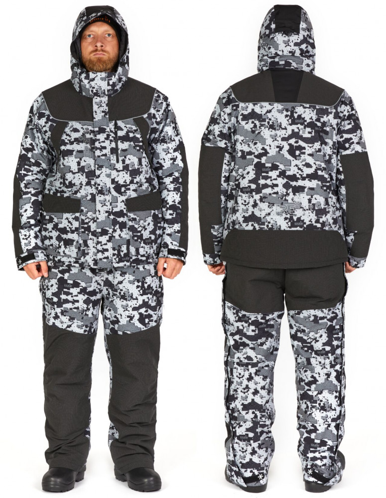 Универсальный костюм для различных погодных условий. Эксплуатация до температуры −45ᵒC. Водонепроницаемость: 10000 мм. Дышащая способность: 8000 г/м²/24 час. Утеплитель: hollofil+ heat system.
