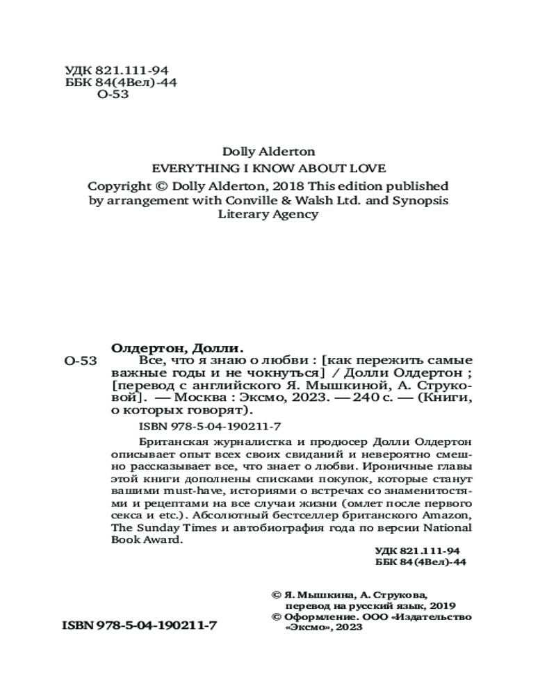 В данный момент этот товар отсутствует в продаже. Возможно, у нас найдется аналогичный или похожий товар здесь. Серия: Книги, о которых говорят «Новая Бриджит Джонс» от нон-фикшен! Запредельно смешная и практичная книга о любви и свиданиях от топовой британской журналистки и продюсера Долли Олдертон, сотрудничавшей с такими изданиями, как GQ, Marie Claire, Grazia. Автобиография года по версии National Book Award, шортлист в номинации «Книга Года» премии «Waterstones», Топ-5 в списке бестселлеров The Sunday Time и абсолютный лидер рейтингов Amazon. Истории Олдертон с легкостью исправляют плохое настроение, а кулинарные рецепты на все случаи жизни (личной жизни — омлет после первого секса и др.) вкупе со списками покупок первой необходимости сделают эту книгу одной из ваших любимых. |