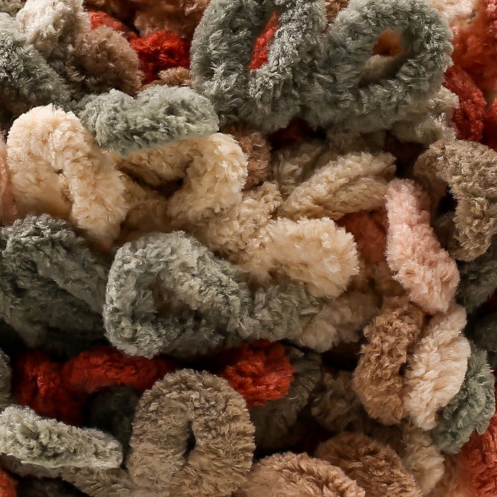 Приятная на ощупь, петельки ровненькие. Размер петель меньше, чем у обычной Puffy, но работать всё равно легко и удобно. Вот такой снуд в позитивной палитре получился из 1 мотка.
