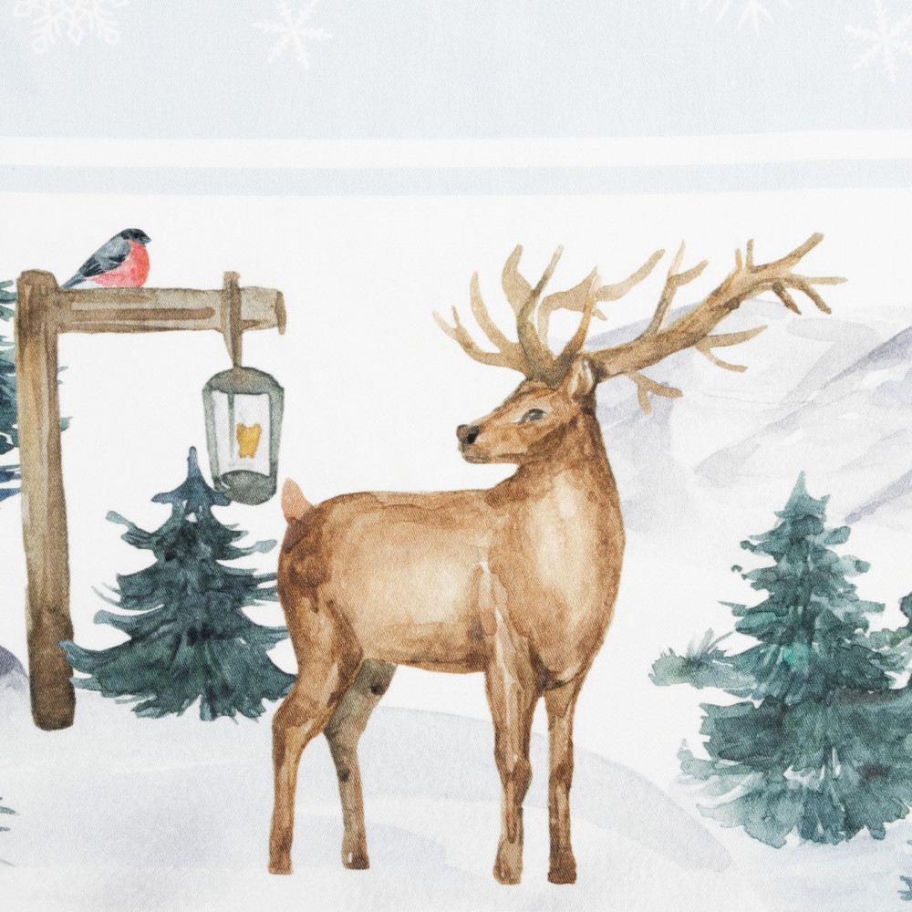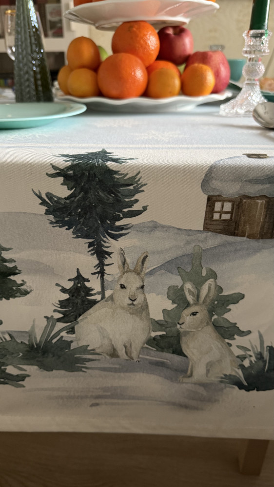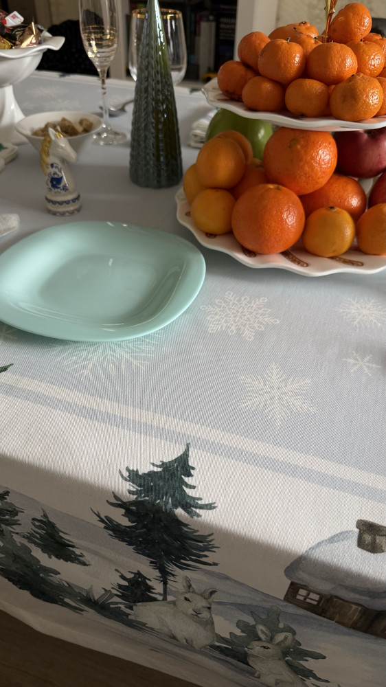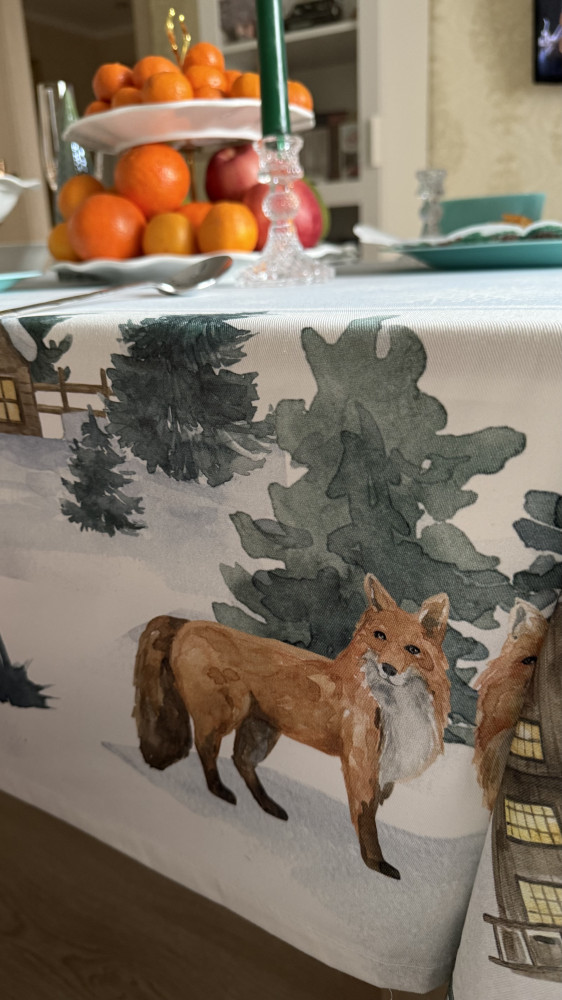 Отличный комплект: скатерть и 12 салфеток 3 салфетки с лисичкой 3 салфетки с оленем 3 салфетки с зайчиками 3 салфетки с домиками Итого 13 предметов. Сама ткань плотная, не просвечивает. Красиво смотрится, рекомендую взять свечи зелёного цвета, хорошо дополняет общий вид 👍