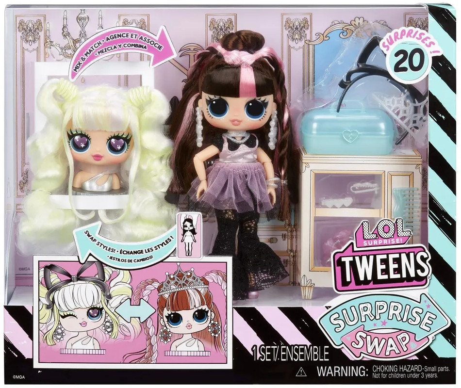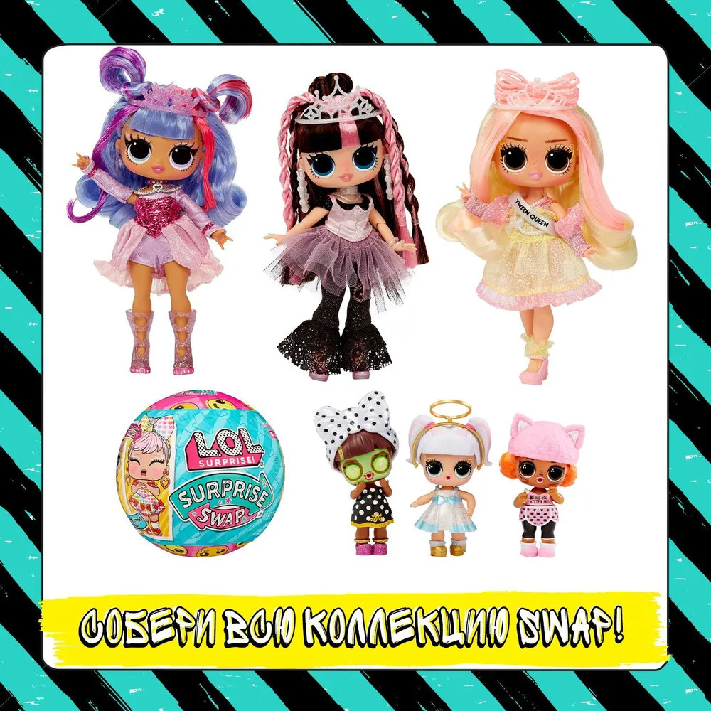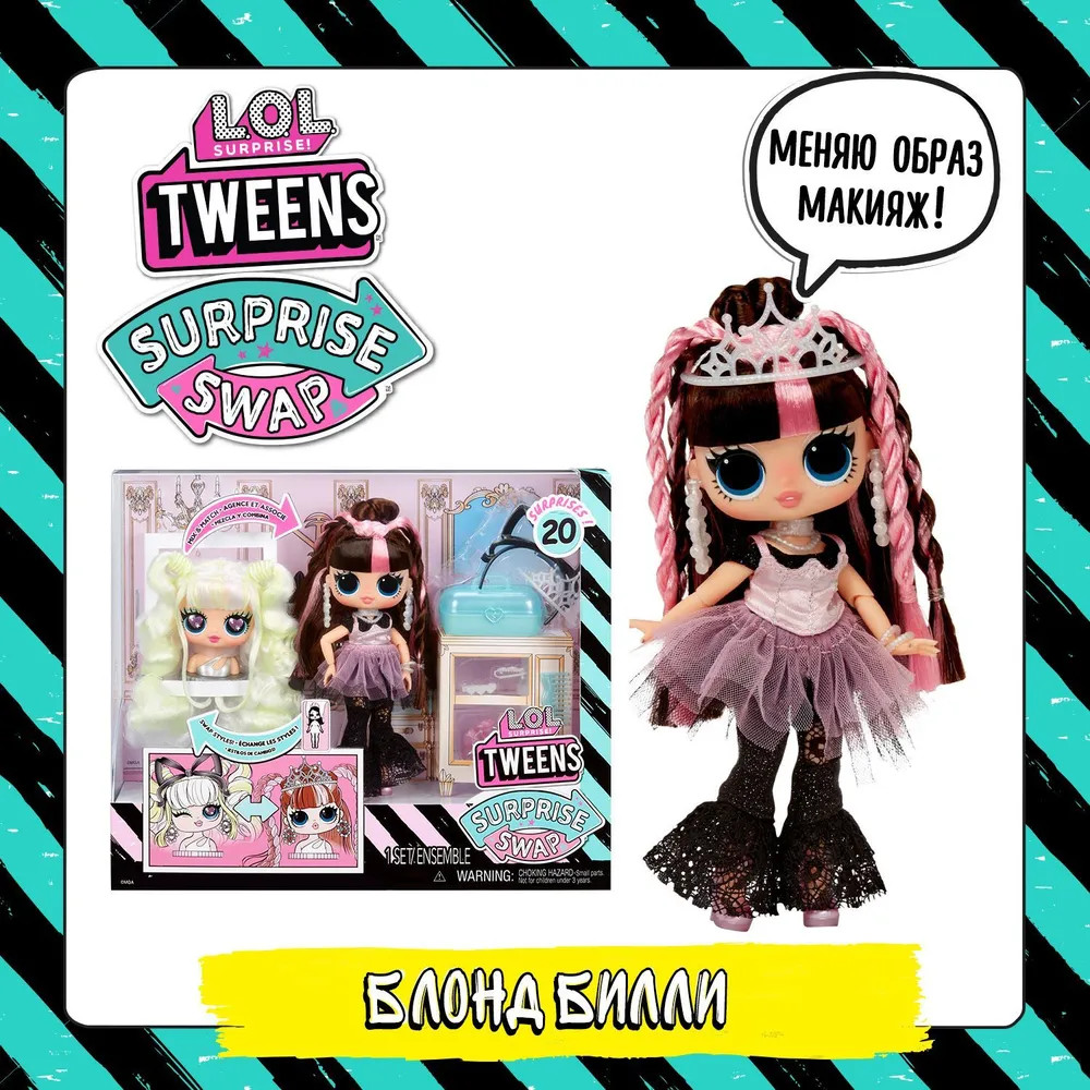 Встречай коллекцию L.O.L Surprise Tweens Swap со сменными образами! Это младшие сестры кукол OMG и старшие сестренки мини-кукол L.O.L Surprise, которые могут изменить свою внешность и эмоцию до неузнаваемости. У кукол Swap два совершенно разных образа в одном наборе, которые позволяют экспериментировать с их внешностью и делать еще больше причесок.