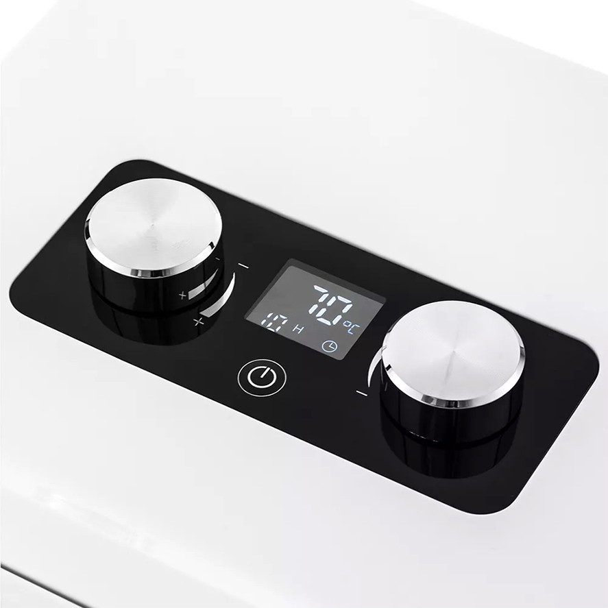 На передней панели устройства есть регуляторы, с помощью которых вы можете установить температуру в диапазоне 35-70 °C с шагом в 5 градусов, а также таймер до 24 часов с шагом 1 час.
