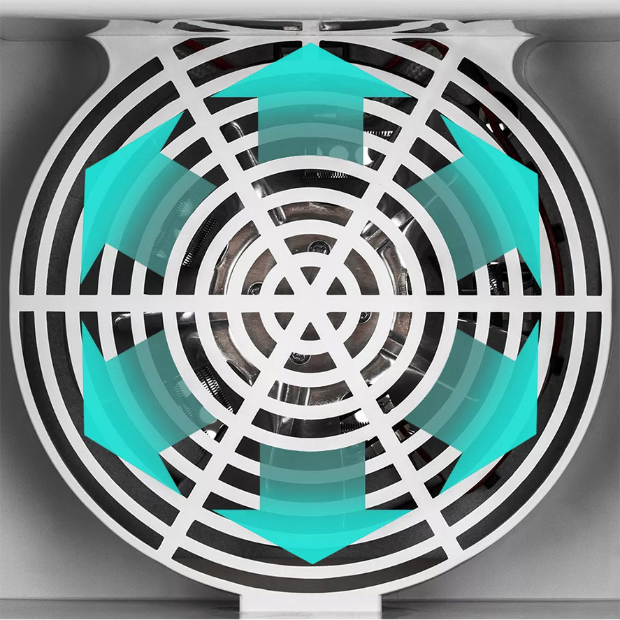 Сушилка оборудована большим мощным вентилятором, что обеспечивает равномерный обдув всех 5 поддонов. Поток воздуха направлен горизонтально, поэтому запахи продуктов с разных поддонов не смешиваются.