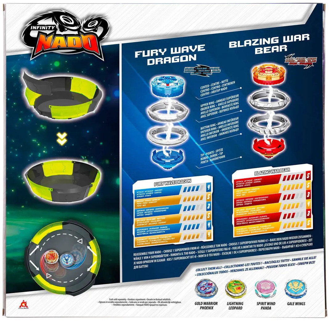 Особый 3D-дизайн Надо 4-в-1: 1 суперсила, 4 тактики! 4 режима игры — 1 основной и 3 дополнительных режима Надо — нападение, защита и баланс. Надо можно пересобирать в зависимости от выбранной тактики. Блейды светятся при вращении и нажатии на аватар. Особенности волчков главных героев из набора: Неистовый Дракон (Fury Dragon) Лина — баланс, Огненный Медведь (Blazing Bear) Алекса — нападение. Вставь Надо в специальное отверстие до щелчка, раскрути волчок с помощью ножен, нажми кнопку запуска. Меч не только пусковая установка, но и монтажный инструмент.