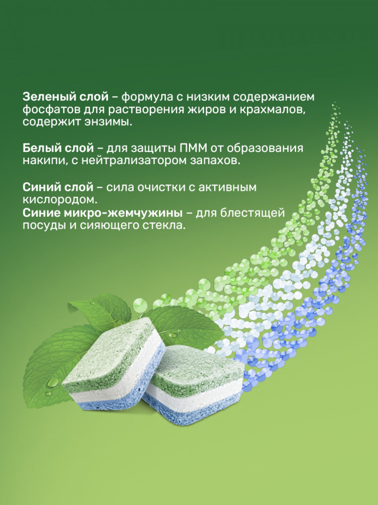 хотелось бы сказать, что это равноценная замена более дорошом таблеткам..но нет. в общем моет очень даже хорошо. к этому притензий нет. но, через пару недель использования заметила, что на посуде начал оставаться белый налет. после замены таблеток проблема исчезла. не очень хорошо работает с запахами. если после biomio запаха нет, то эти таблетки не очень хорошо справляются, как бы все чистое, но открываешь посудку, а запаха чистоты нет. заметила такое со сковородками после жарки котлет