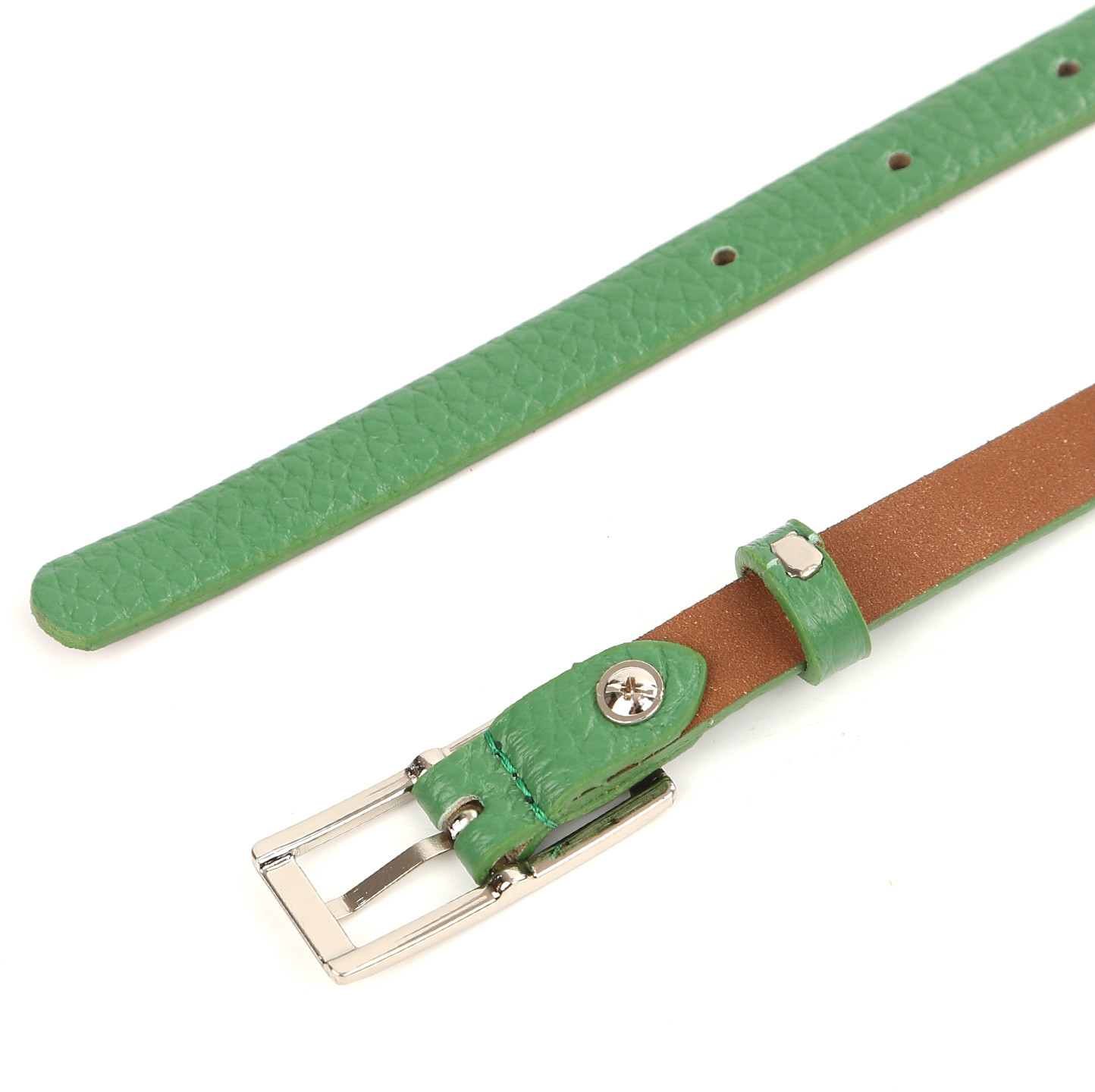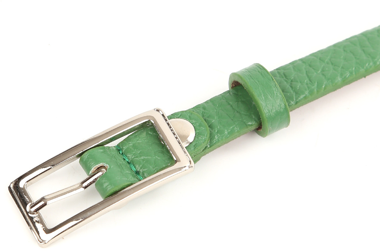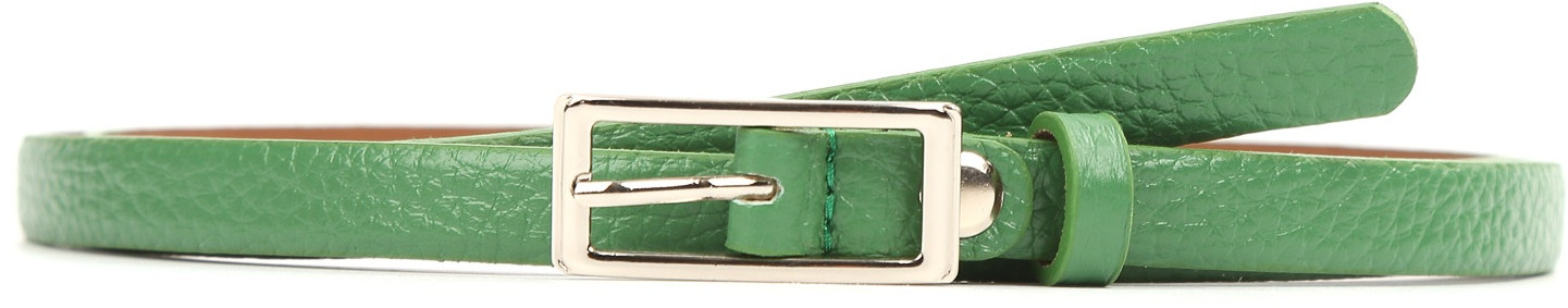 Изящный узкий ремень в зеленом оттенке выполнен из мягкой зернистой кожи. Тыльная сторона — из гладкого плотного спила. Модель дополнена аккуратной пряжкой из прочного гальванического сплава с покрытием — серебро. Пряжка крепится к изделию с помощью винта, что позволяет легко отрегулировать длину. Две шлевки из зернистой кожи в тон изделию: одна закреплена, вторая — подвижная.