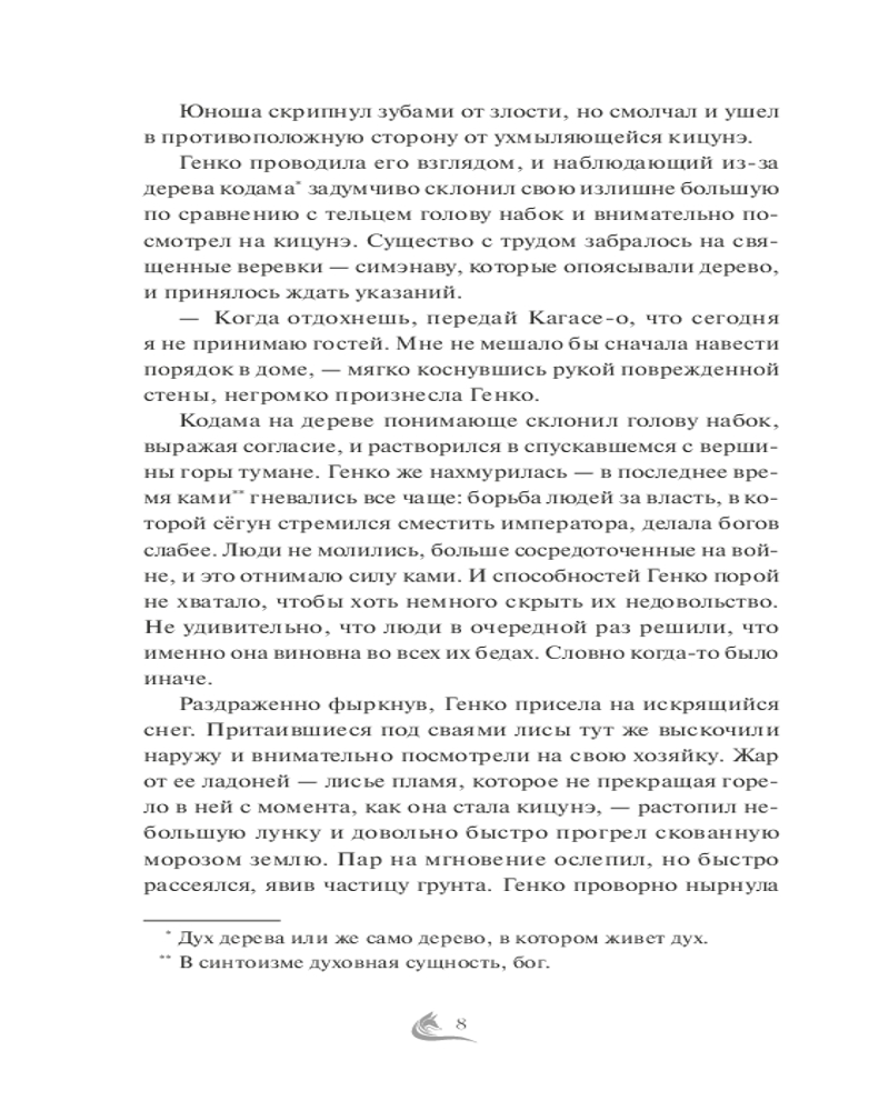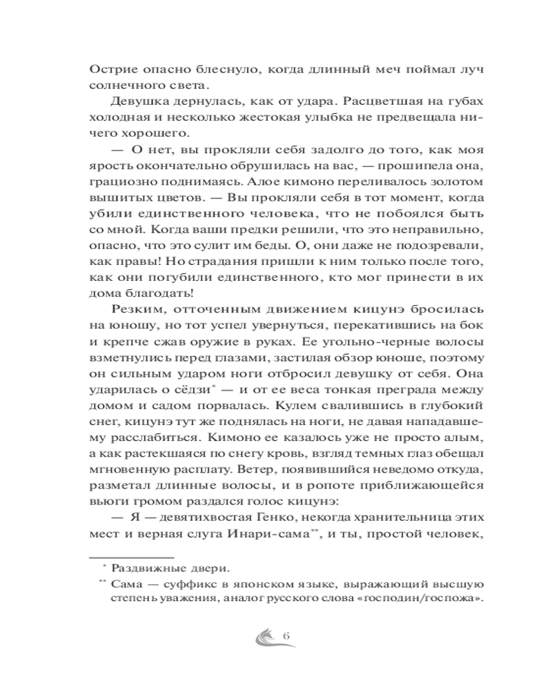 Интересная книга дающая чувство полного погружения в японские мифы и легенды. Сам сюжет, возможно, и не блещет особой оригинальностью, ибо использует в качестве механизмов своего продвижения извечные темы о дуальности всёго происходящего вокруг (всё не то, чем оно кажется) и «они слишком разные, чтобы быть вместе, но…», однако использование этих тем в не самом тривиальном ключе и при наличии глобального противостояния (в данном случае, среди божественного пантеона) делают роман затягивающим и интригующим. К тому же у автора определенно есть вкус и чувство меры, что позволяет ей не скатываться к банальным ходам своих персонажей и не перегружает читателя бессмысленными клиффхэнгерами и таинственностью ради таинственности. Когда же центральный конфликт книги подходит к своему апогею, то читается, можно сказать, взахлёб. Ну, а само издание, выше всяких похвал и только 10/10.